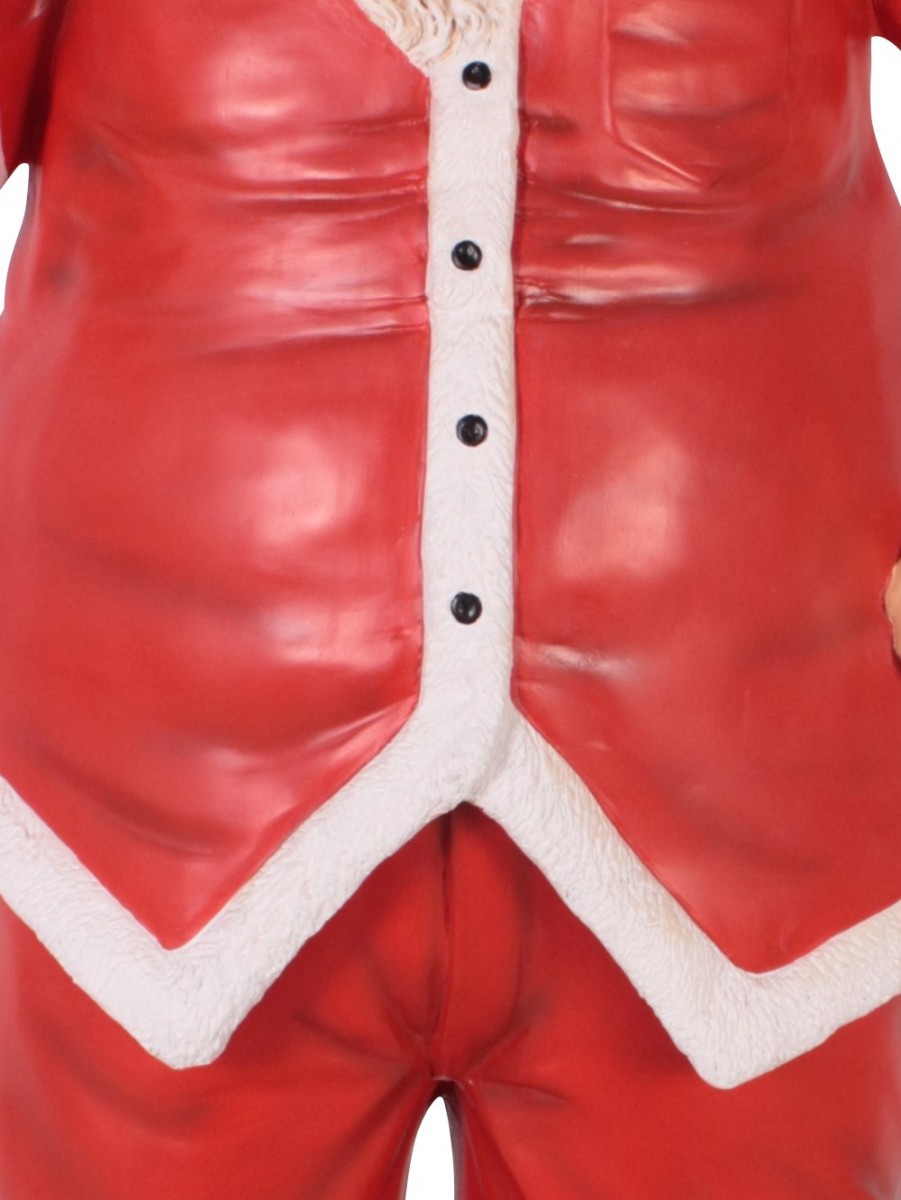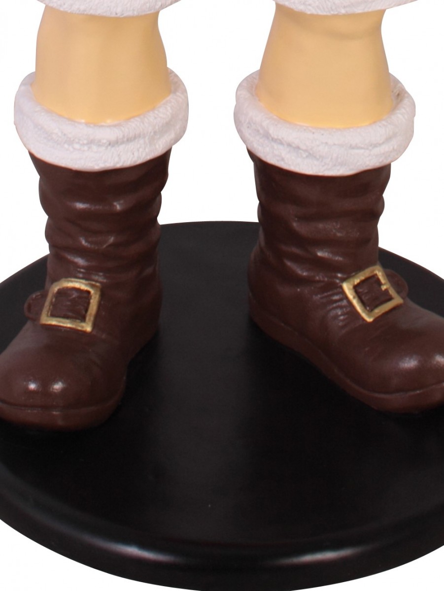 Standing on a large black coloured disc, Saint Nicholas stands erects as he sends his festive greetings with his raised right hand. Santa is depicted as being fully dressed for his yearly summer vacation. Using top quality resin material, he is depicted as wearing brown leather boots with gold buckle and white trim. Proceeding upward is a red short suit with white trims and black buttons. He also wears a wide brimmed brown leather hat. Of course, Father Christmas didn't forget to wear his round framed reading glasses.