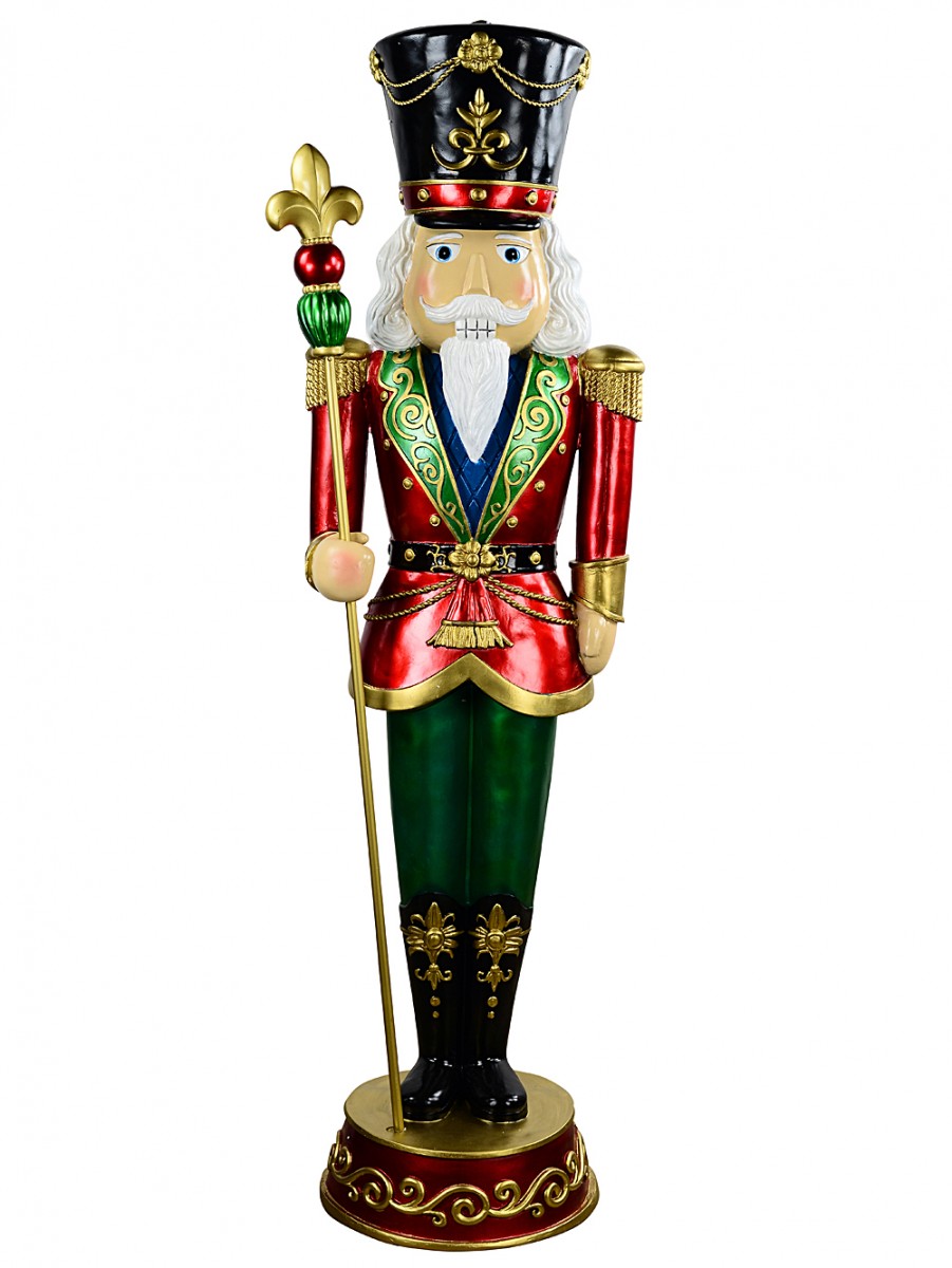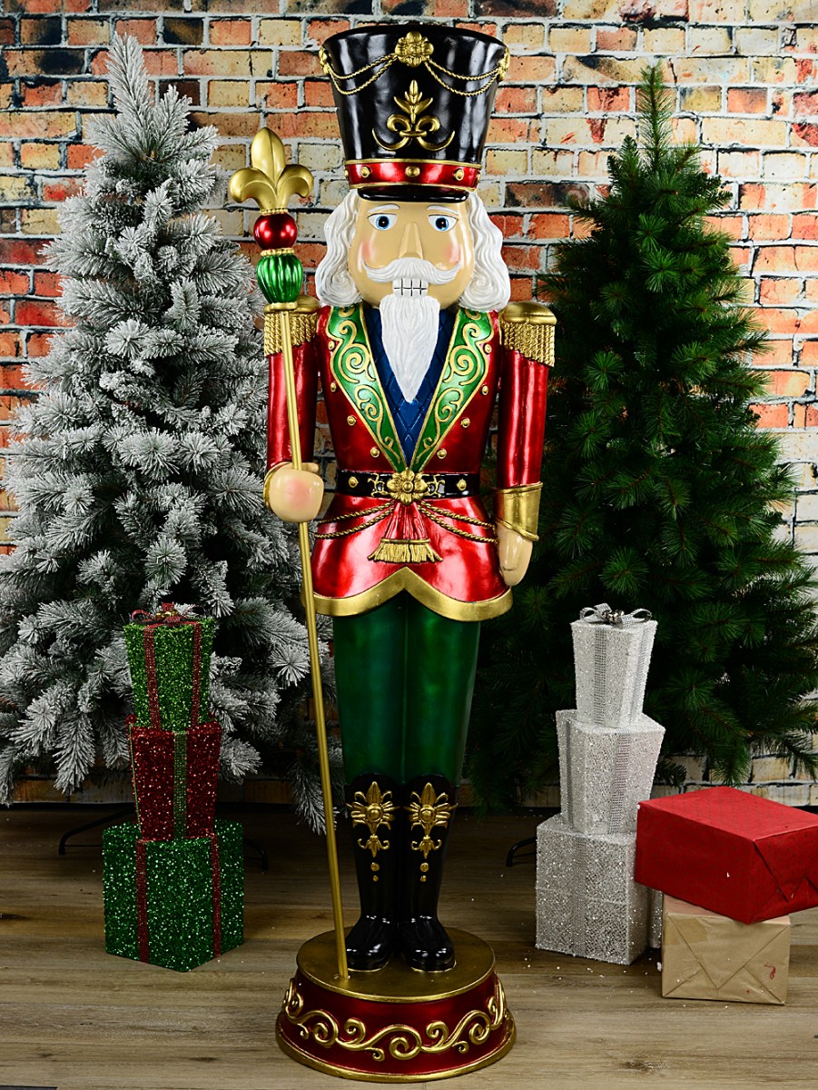It's got all those little things that make it look and feel so special - gold flur-de-lis sceptre with classic red and green, a black shako trimmed with gold ornaments, beautiful white hair with a bold moustache and beard. And we can't get enough of that detailed jacket! Finishing your Christmas display with a life-size polyresin ornament like this is pure magic, and you'll feel its holiday luck every time you walk by.