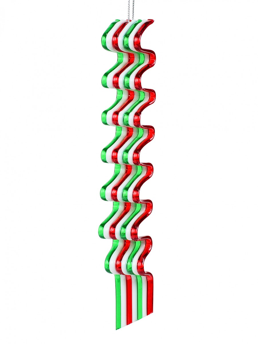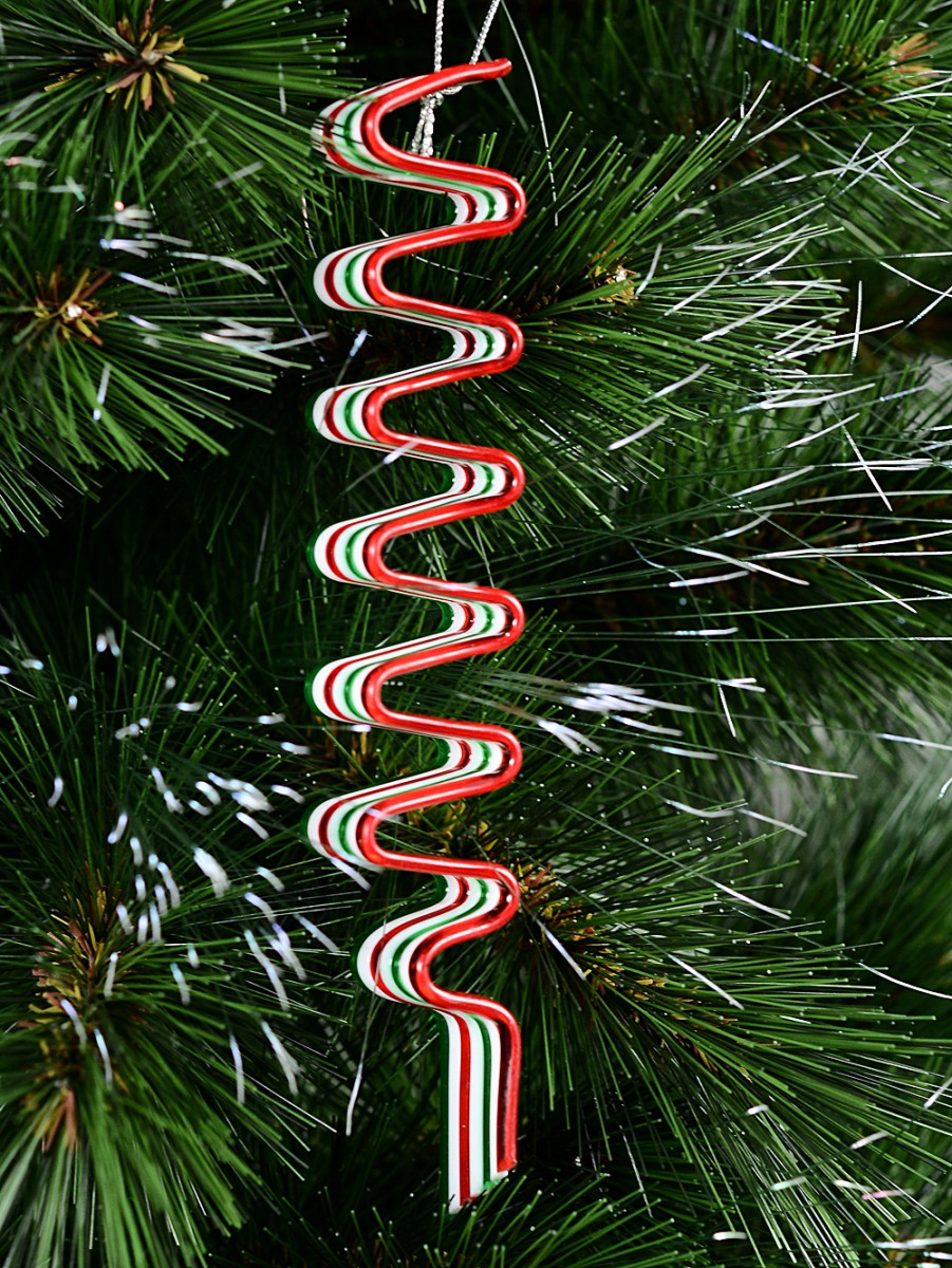 Featuring a delightful and nostalgic holiday ornament that captures the essence of traditional wavy ribbon candy. Plus, its layered red, green, and white stripes pay homage to the classic colours of Christmas, instantly evoking the festive spirit of the season. With an attached silver string for effortless hanging, this piece is designed to evoke warm memories of Christmases whether adorning your Christmas tree, enhancing wreaths, or bringing a touch of holiday cheer to any space. Use this cherished keepsake to bring the magic of the holidays to life and create a warm, inviting atmosphere for all to enjoy.