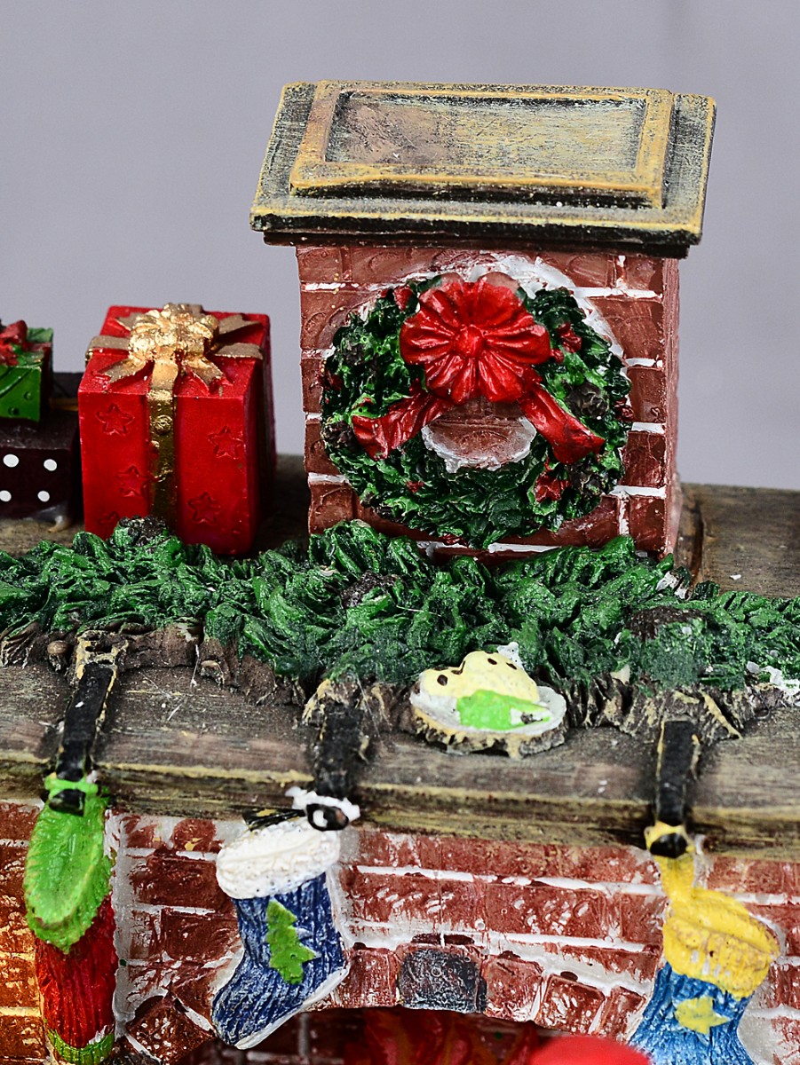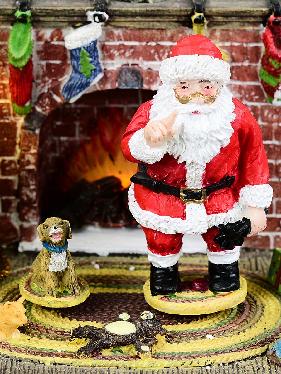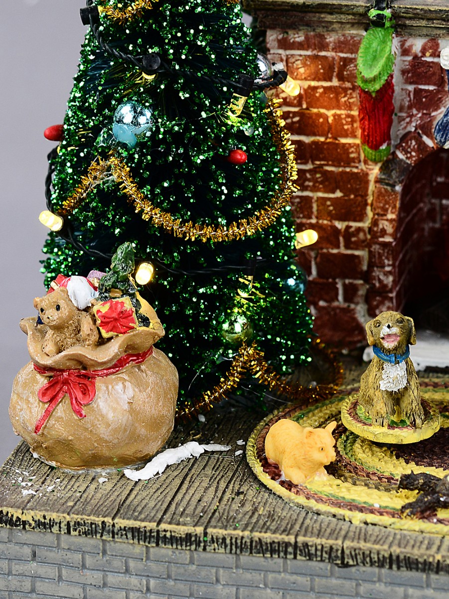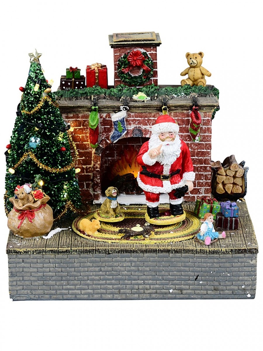 This delightful, animated, illuminated, and musical miniature figurine is meticulously crafted to capture the magic of Christmas. Witness Santa Claus, in his traditional red suit and trademark eyeglasses, delivering presents by a beautifully decorated fireplace. The scene includes a Christmas tree adorned with baubles, tinsel, and 14 warm white LED lights, creating a captivating glow that brings the festive spirit to life.