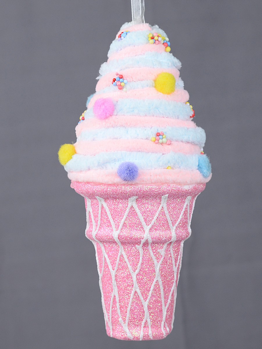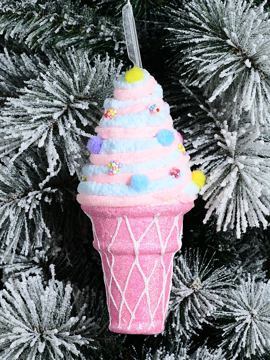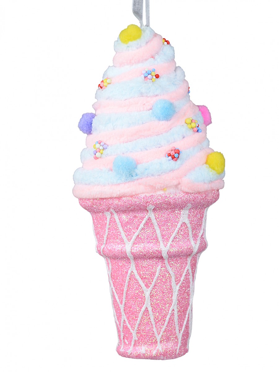 We can't get over how realistic those hot pink cones look with their delicate white cross patterns and iridescent glitter. And then there's the swirl of pastel blue and pink soft serve piled up high - too good! To top it off (literally), you'll find cheerful pom poms in yellow, purple and blue, plus clusters of what look exactly like hundreds & thousands for that extra burst of whimsy. The whole thing is crafted from lightweight Polystyrene-like material, making it sturdy but easy to hang anywhere you like on your Christmas tree with its attached white mesh loop.