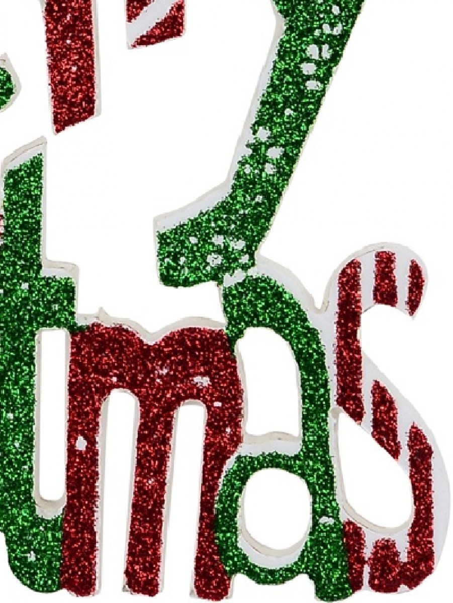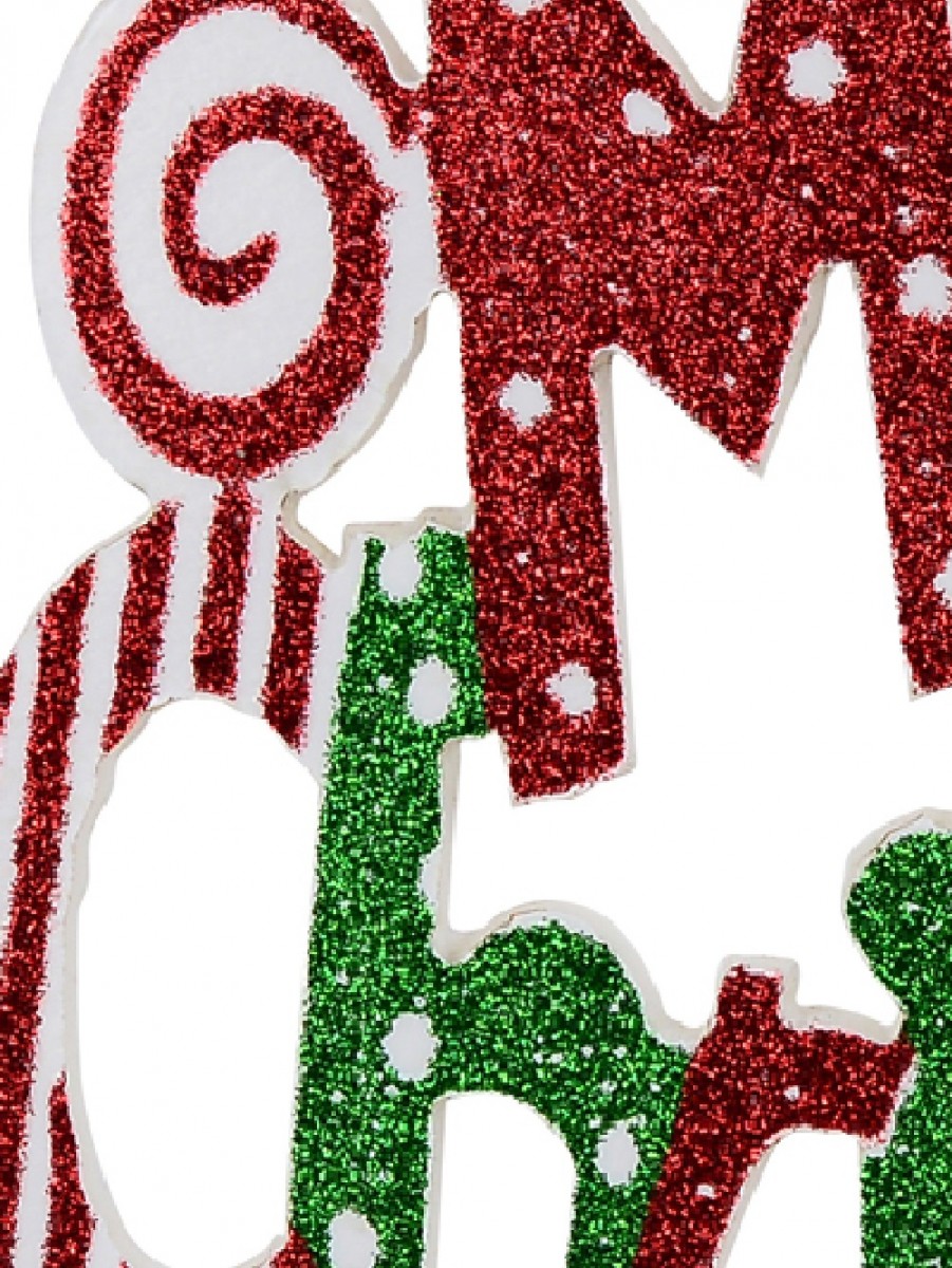Featuring the words "Merry Christmas" spelt out in eye-catching letters, each meticulously adorned with various decorative patterns, adding a touch of whimsy to the sign. While some are covered in solid glitter, giving them a dazzling appearance, others showcase stripes, dots, and circular patterns, creating a visually dynamic display. Plus, the overall colour scheme is a classic combination of red and green glitter on a pristine white background, creating a striking and cheerful contrast and making it a delightful and festive addition to your holiday decorations. For a charming display, this sign comes with an attached red mesh fabric loop so you can effortlessly incorporate this cute Christmas decor into your Christmas tree and wreath.