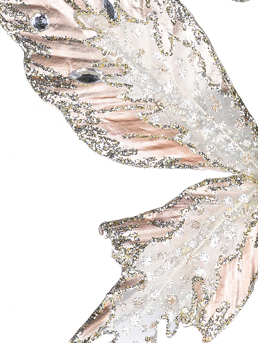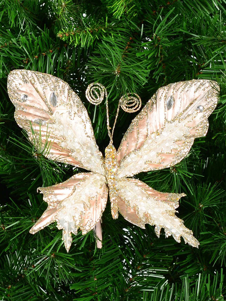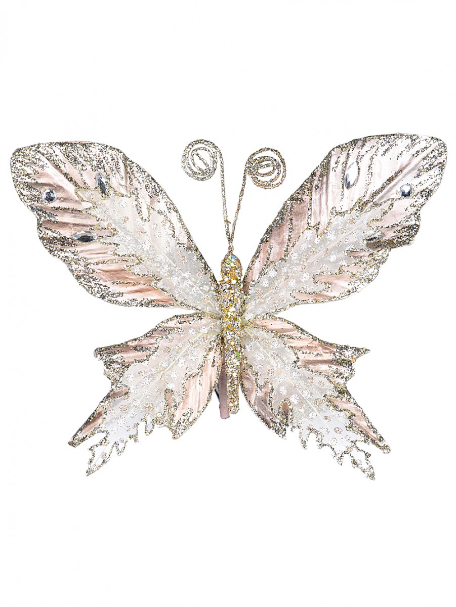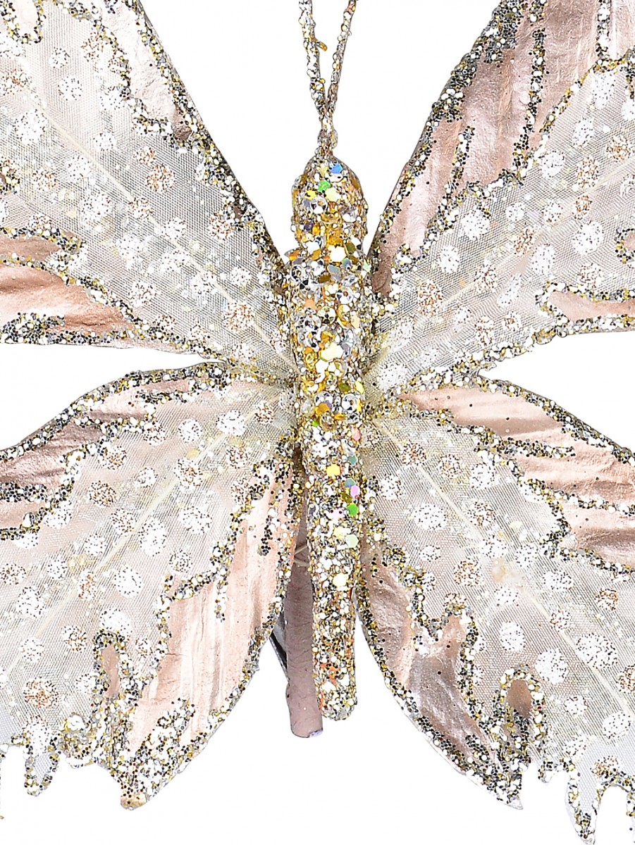 The vibrant gold and silver hue of this butterfly pops. Having this butterfly in your home can introduce the wonder of nature and bring a message of new beginnings. The beauty of this design is that it can stand out against any surface, allowing its ethereal beauty to take centre stage. This butterfly motif will not only charm up your space, but also spread the positive energy of transformation and rebirth. Combining bright gold and silver glitters that spread throughout its abdomen, antennae, and wings, this special butterfly will bring your interior to life. Perfect for decorating your Christmas tree, bouquet, and wreaths, this piece can also stand alone when fixed to any surface. Create an air of friendliness and cheer in your home with our rose gold butterfly ornament.