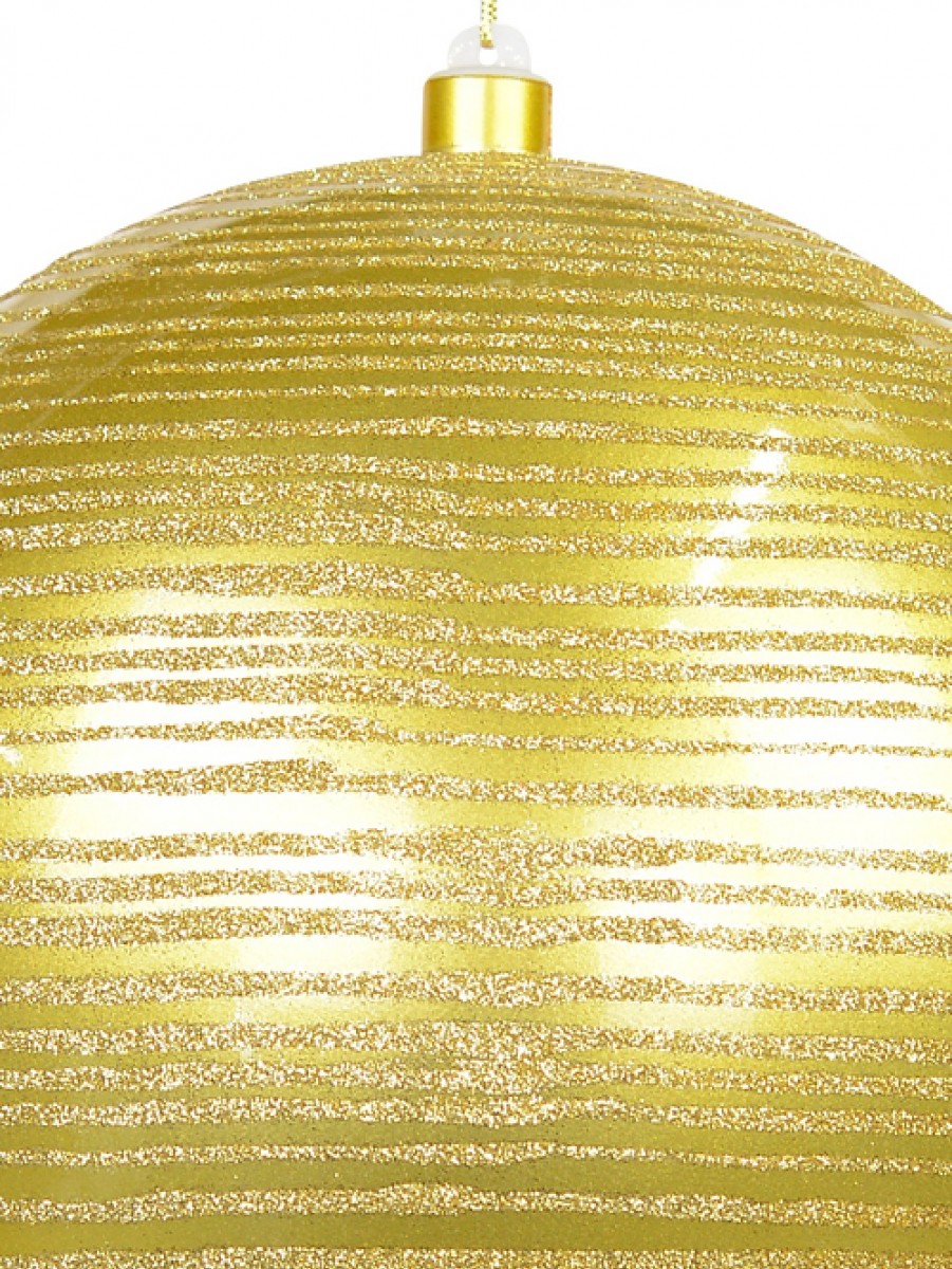 Twirling and swinging on a large Xmas tree or from the ceiling or entryway, the glossy exterior of this large and striking giant gold glitter striped bauble will reflect all of your evening lights. Measuring 25cm in dimension, this gorgeous ornament has a magical enchantment to it and is perfect for large area decorations including but not limited to stores, parties, weddings or events.