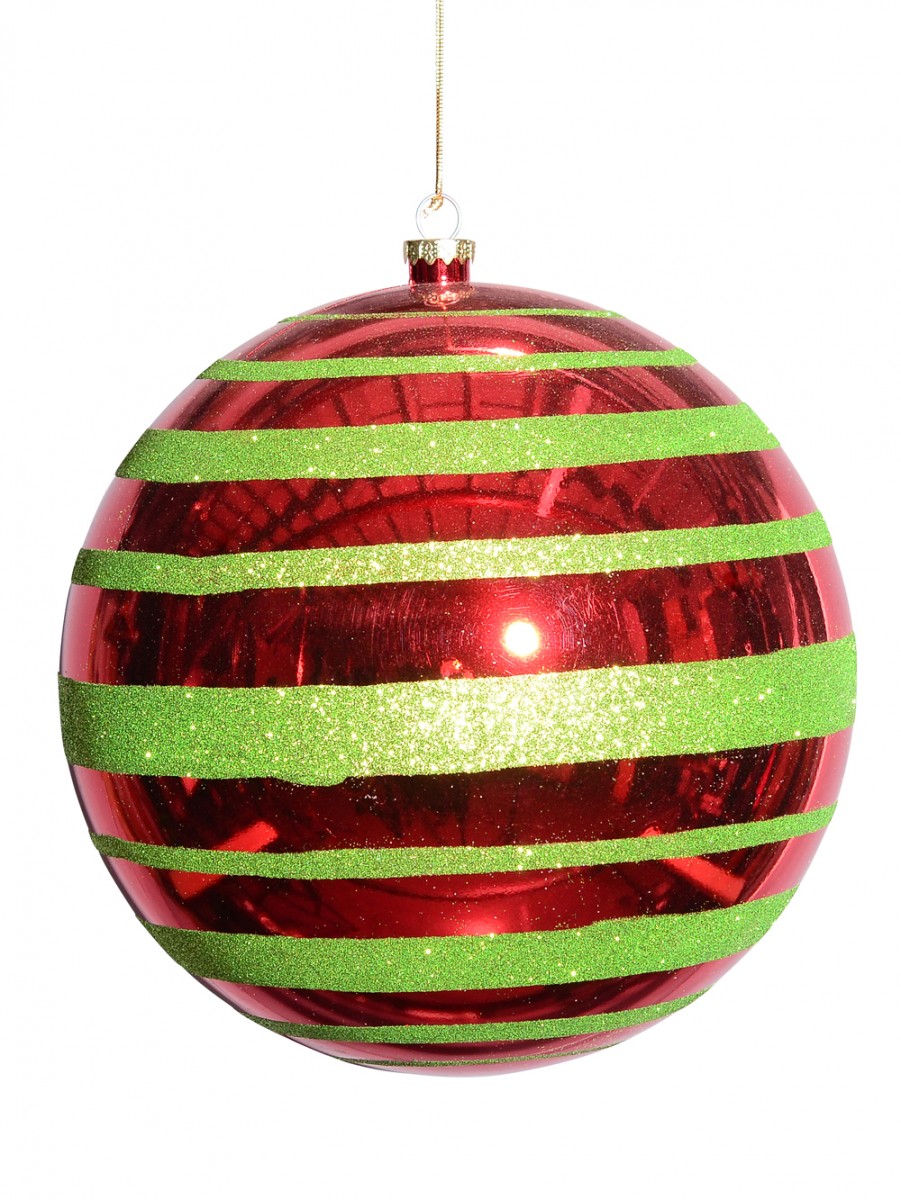 This cleverly crafted Christmas tree bauble would add an ornamental feel of originality to your Christmas decoration this year. It is an irresistible ornament with an outstanding look achieved through its savvy choice of alluring colours and glittered spray. The extra-large bauble is made in a vibrant, glossy red colour with nine green glittered horizontal stripes across the spherical frame. It looks dazzling particularly because of the glittered green stripes. This is why it will blend in perfectly with your Christmas decor since it is coloured in two of Christmas traditional colours. Place your order now as we soon may run out of stock for this amazing ornament.