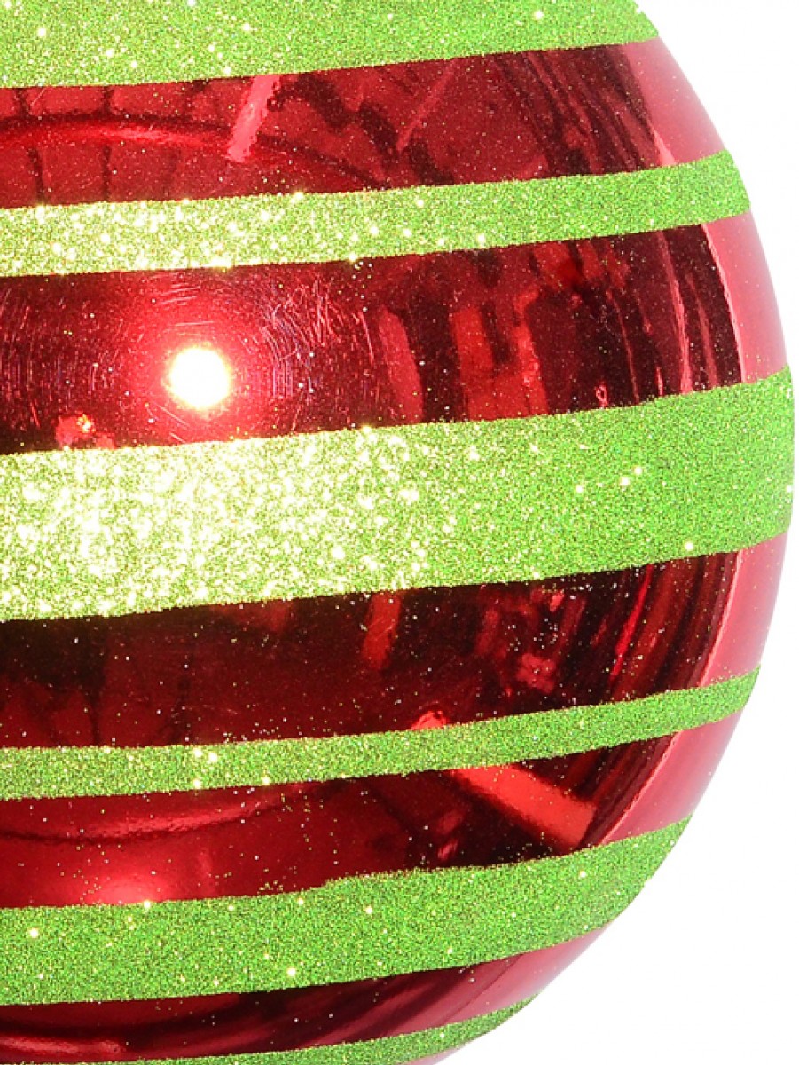 Measuring a whopping 25 centimetres, the Giant Metallic Red Bauble With Green Glitter Stripe Design is a novel ornamental piece with a feel of originality. It is the perfect ornament with which to add subtle finish to your Christmas decoration this Xmas. It is a breath-taking bauble with a deeply alluring red colour and green glittered horizontal stripes.