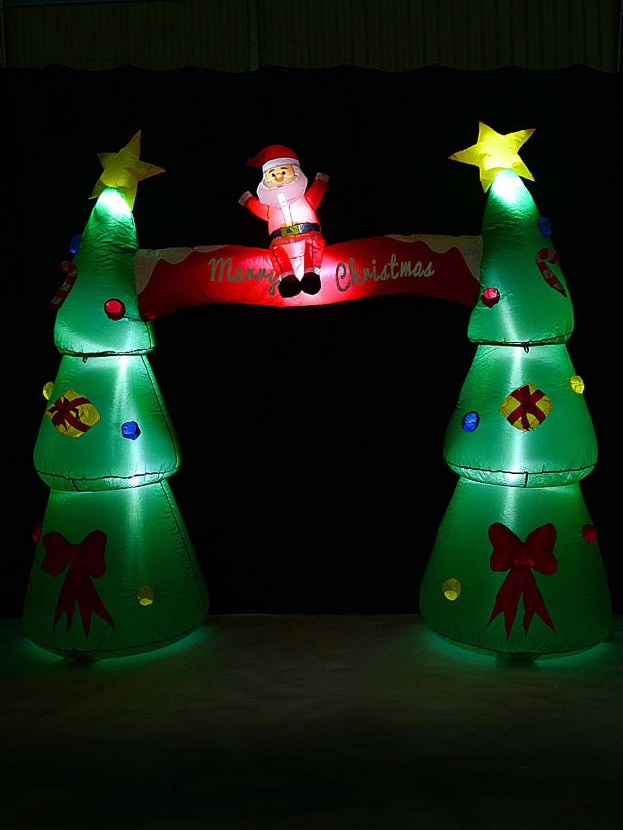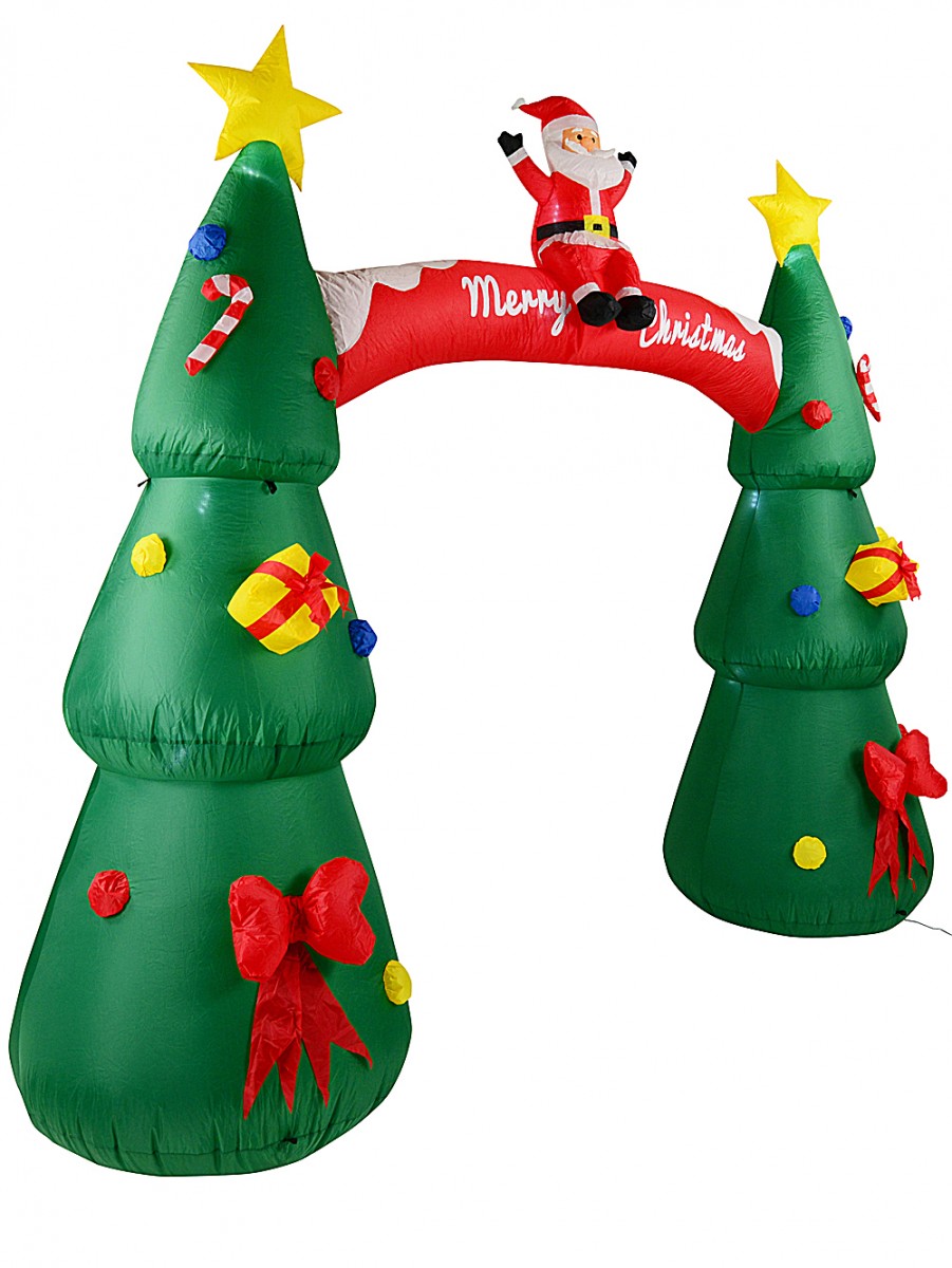 Ah, nothing says 'Christmas at our place' quite like a bright, cheerful archway! Our 2.5m Santa On Decorated Trees Arch Illuminated Inflatable is the kind of decoration that gets your family grinning before they're even inside the door. And we're not even kidding - there's a jolly Father Christmas sitting right on top with his arms up, wearing his classic red suit, surrounded by lush green Christmas trees covered in gifts, bows, candy canes and baubles of every colour! We always find the yellow star toppers just make the whole thing pop.