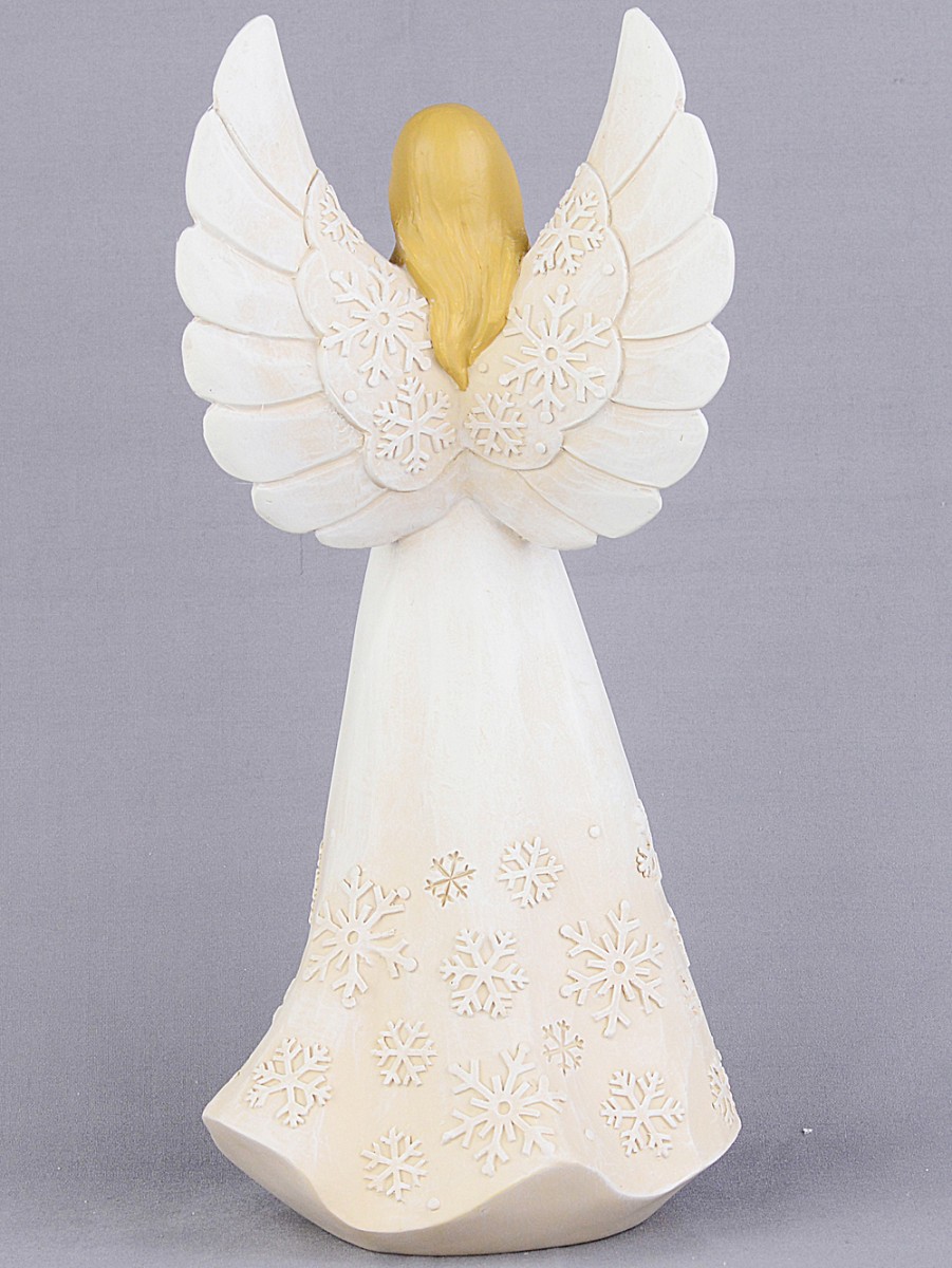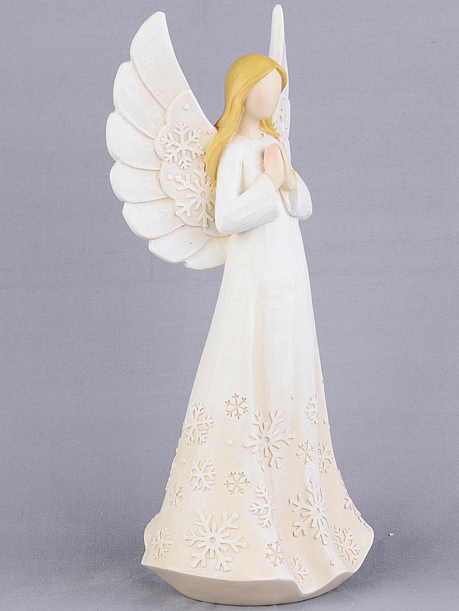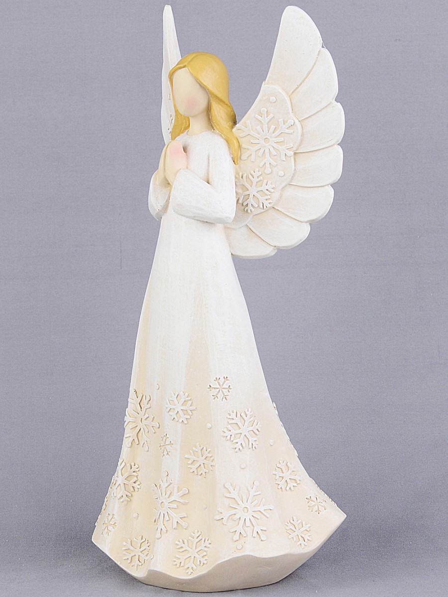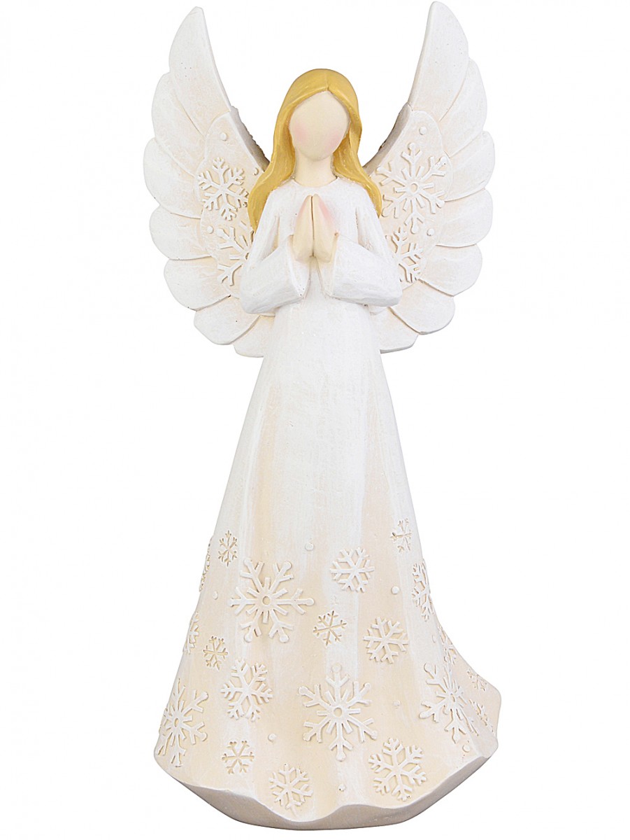 Ah, this 26cm Elegant Ivory Look Blessing Angel Resin Figurine - it's such a beautiful and subtle way to bring that gentle, loving spirit of Christmas right into the heart of your home. She stands 12cm wide by 12cm deep and 26cm tall, her long blonde hair flowing down over her lovely, featureless face. This angel holds her hands gently in prayer, almost as though she's blessing your family as you gather during the most magical time of year. We love the detail on her wings too - they're covered in delicate snowflakes ranging from dainty 10mm ones up to bigger 30mm ones.