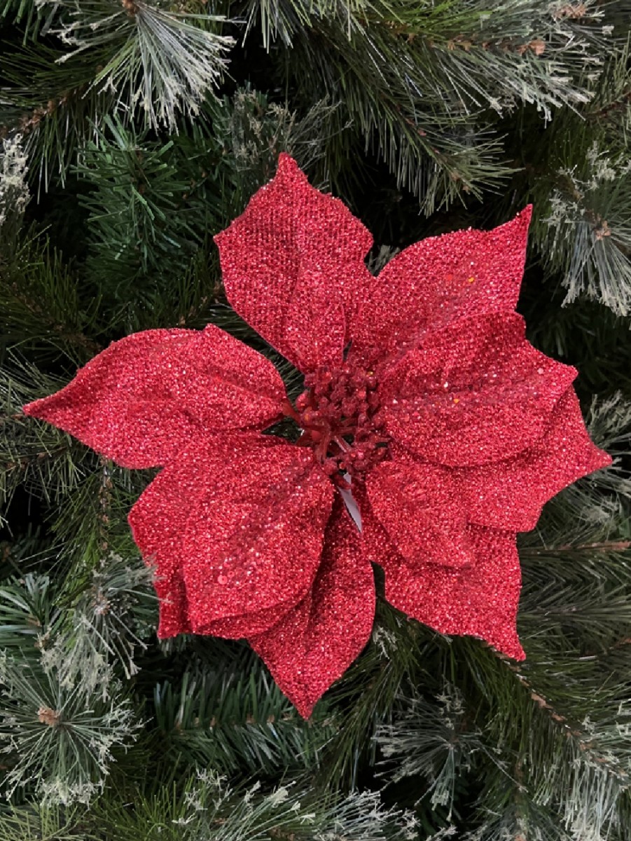 Looking for artificial Christmas floral picks to decorate your fir tree or for your DIY holiday flower arrangements? Choose our Red Glitter Poinsettia Clip-On and you will not be disappointed! Its glittering petals with sequined embellishments give dimension and a pop of colour to your Christmas tree, centrepiece, fireplace mantle and flower arrangements.