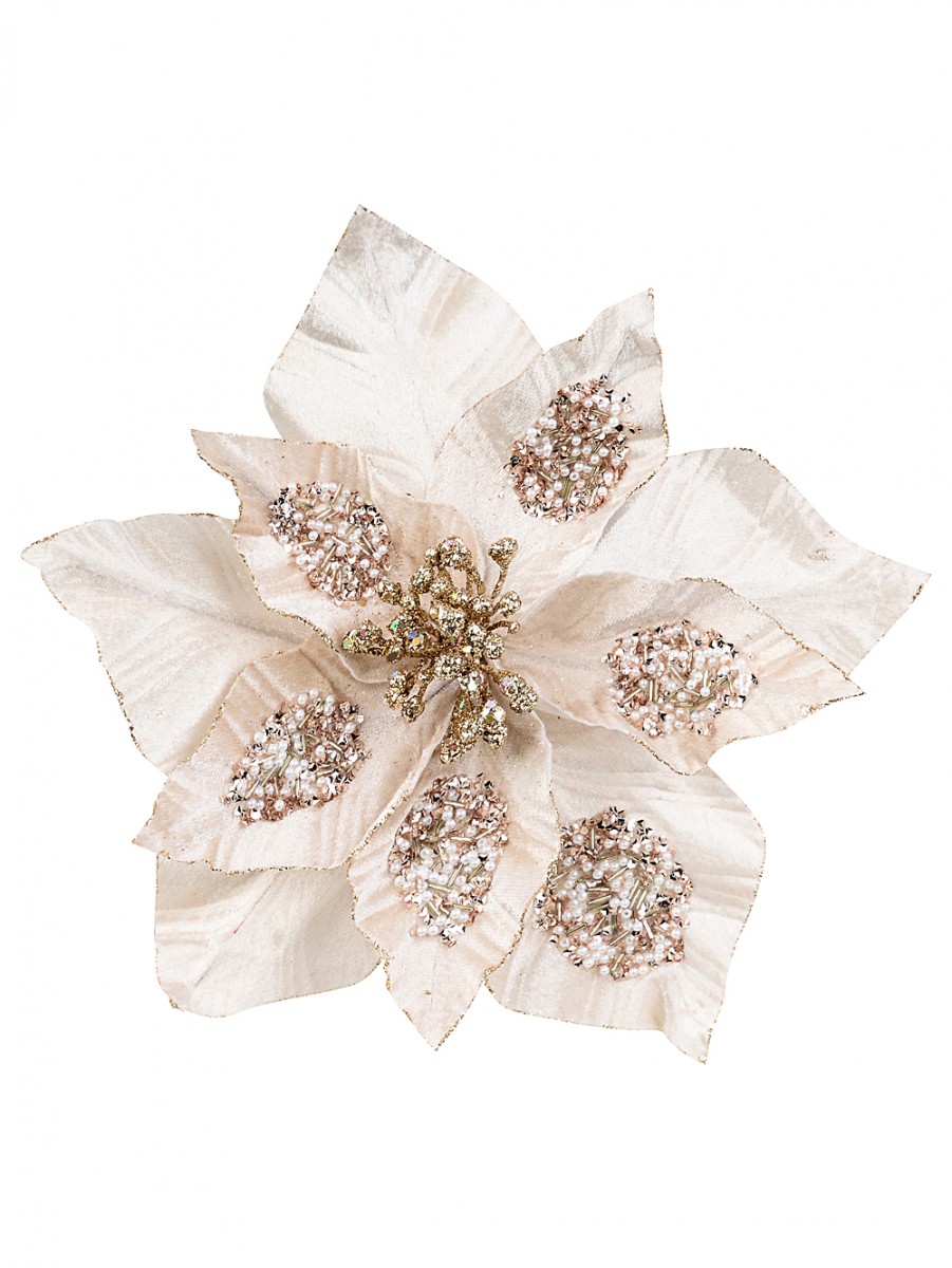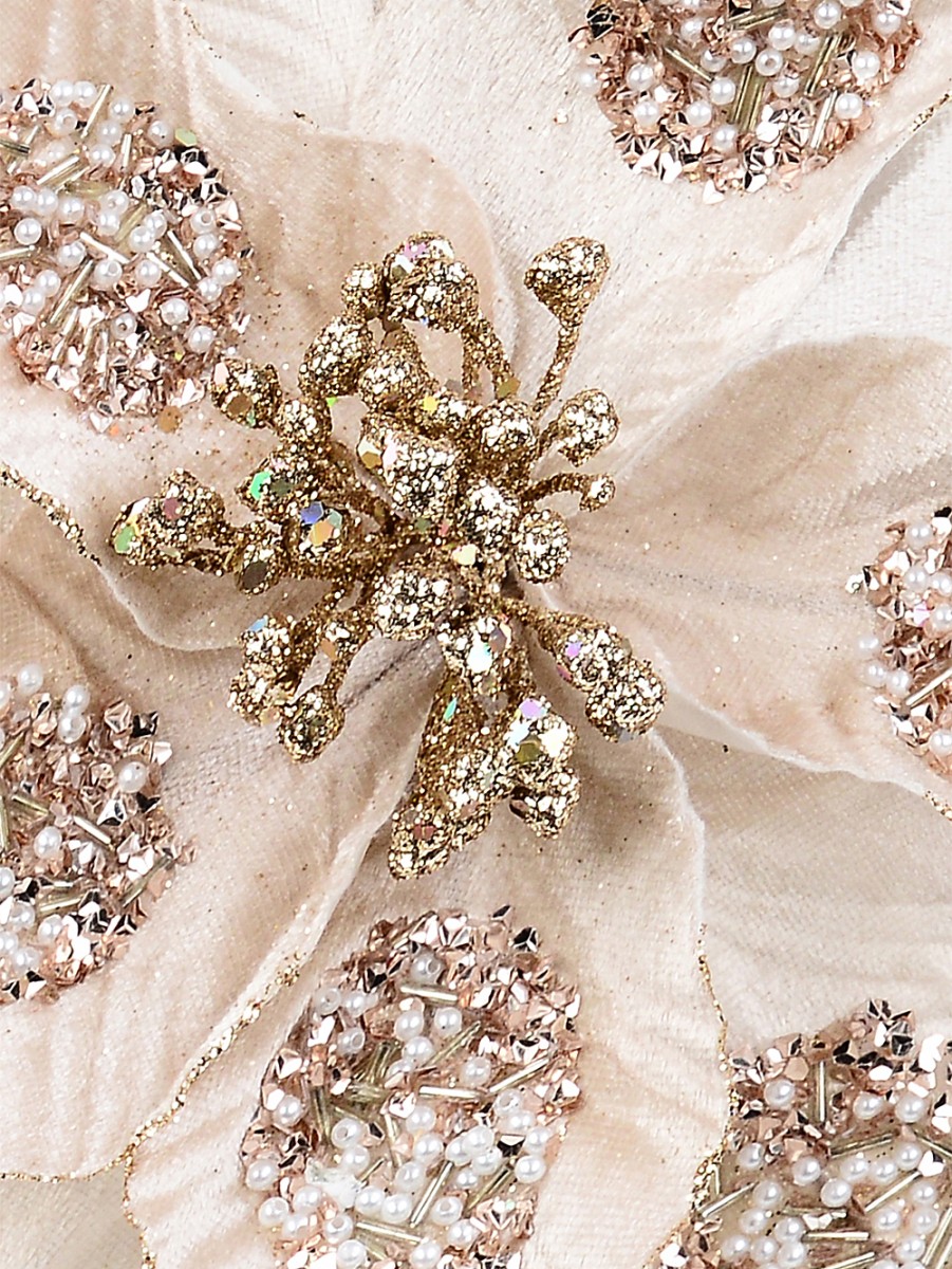 Some bracts are plain and velvety, while others have a stunning centre decoration with white pearls, rose gold sequins, and these delicate clear bugle beads. The middle is finished with a big sequin-and-glitter bloom in champagne tones - it draws your eye in right away. The wired bract makes it really easy to shape on the tree (or wreath or garland, if you want).