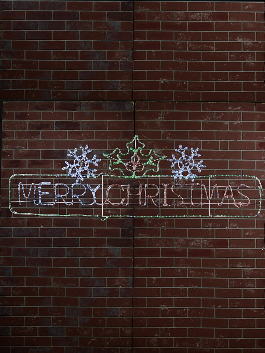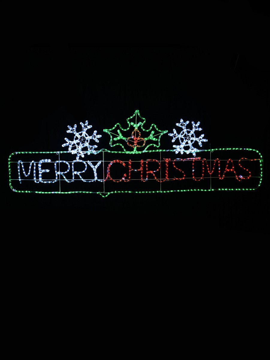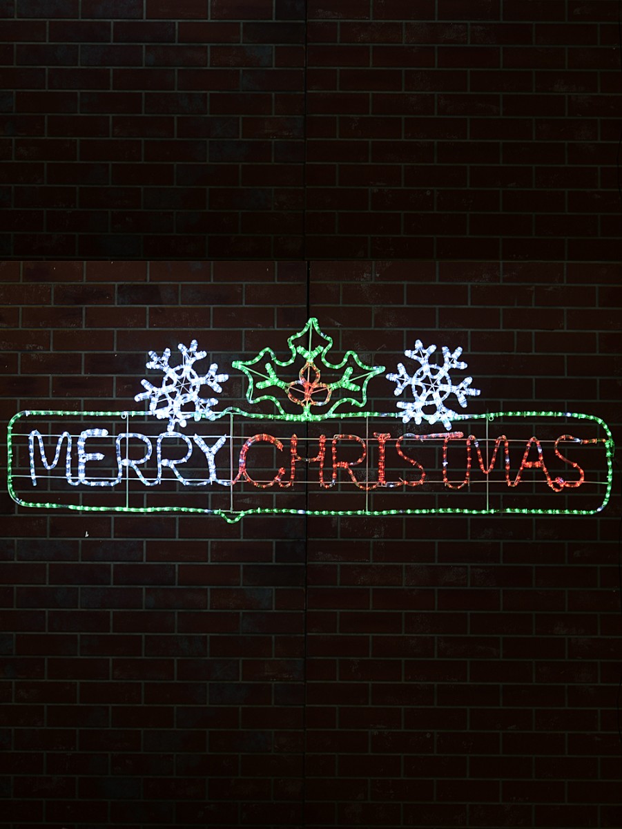 Standing at an impressive 2 metres in length, with a sleek frame measuring 14mm by 63cm, this light display weaves a stunning visual narrative with its vibrant illuminations. The cheerful message of "Merry Christmas" is artistically captured in a combination of cool white and red LED lights, perfectly complemented by a border of bright green. The design features intricate snowflakes on each end and a beautifully decorated holly centrepiece with vivid red berries, set against a backdrop of green.