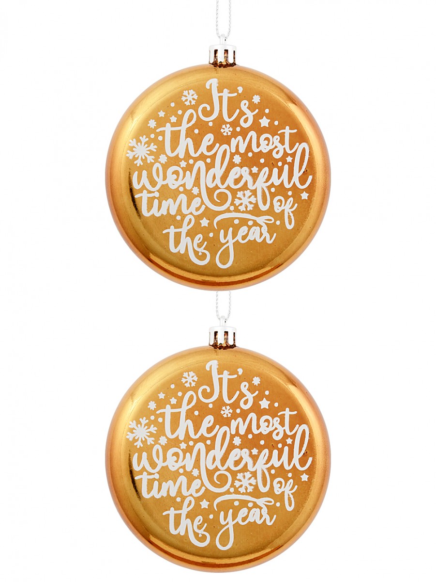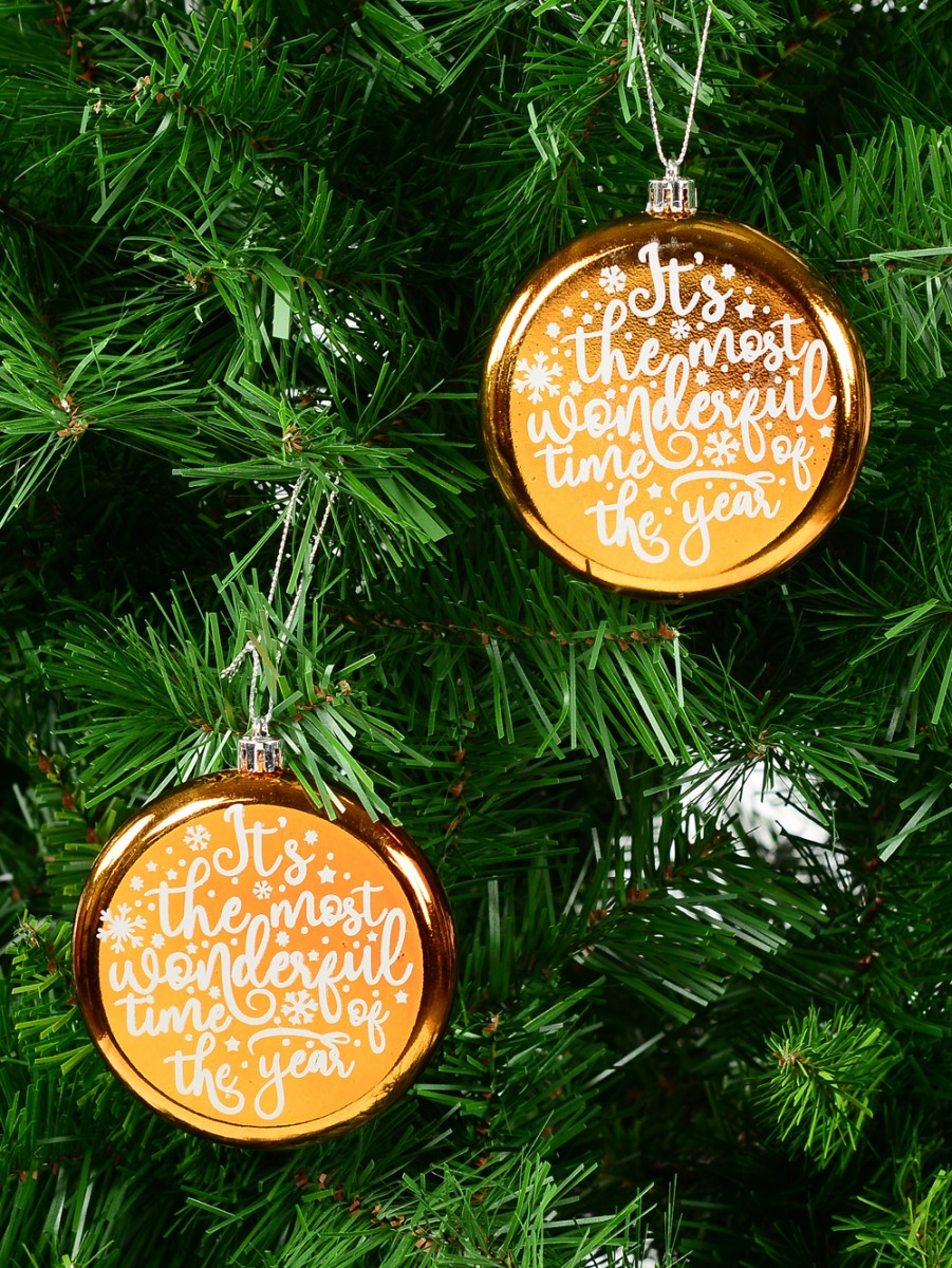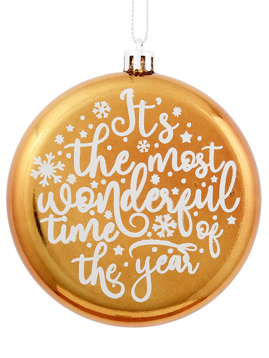 With each of this Wonderful Christmas Font On Gold Disc Tree Hanging Decorations sold with a pre-attached white coloured string, decorating and celebrating Christmas just became all the more fun filled and all the more stress free. This spherical shaped Christmas themed ornament has on its circular surface words of festive greetings written in white coloured cursive fonts over a cool gold coloured backdrop.
