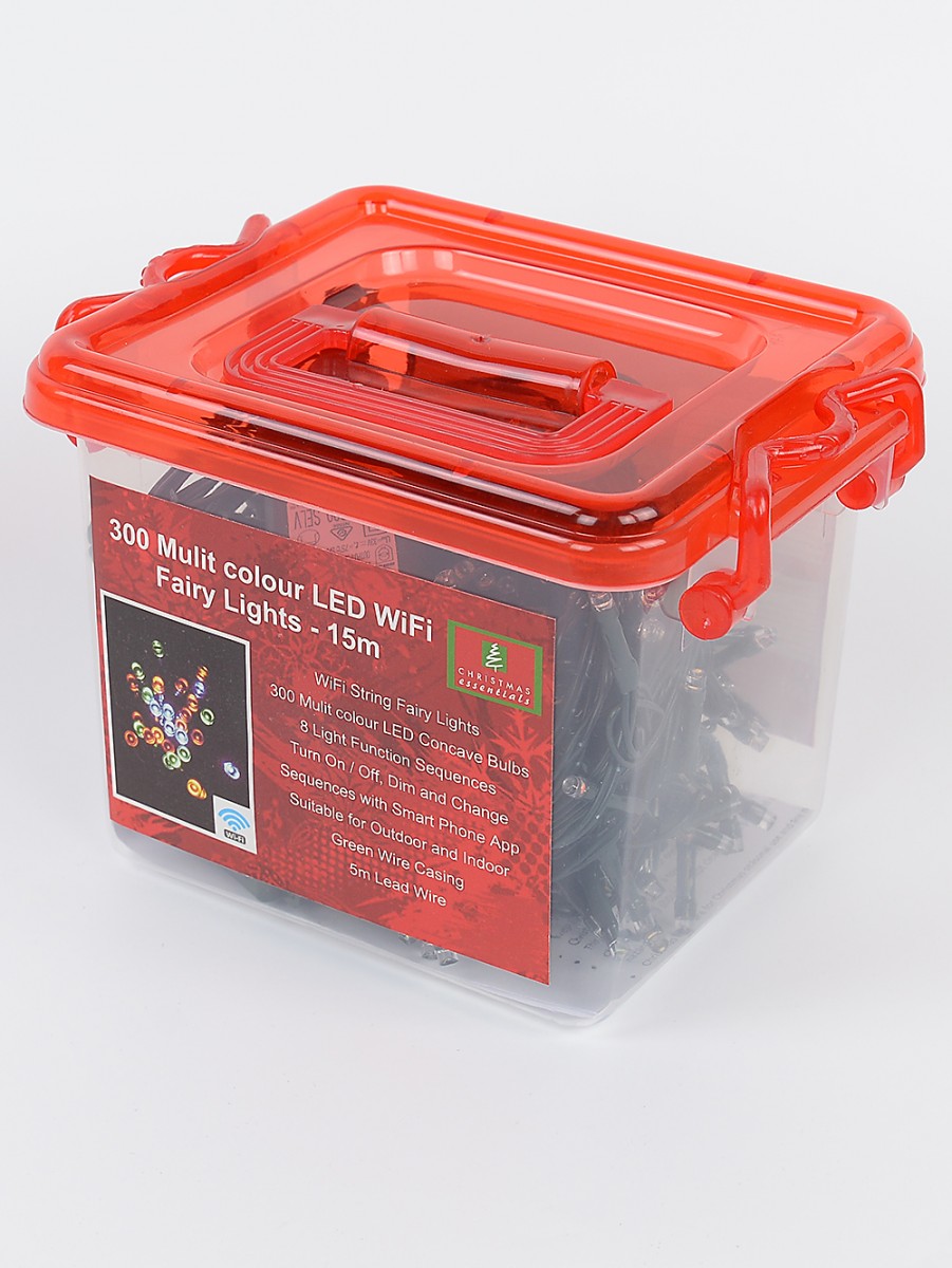 The 300 Multi Colour LED Concave Bulb Wifi Christmas Fairy String Lights is a lovely string of Christmas fairy light which is sold individually and consists of 300 multiple coloured concave shaped LED bulbs. These bulbs are arranged 50 millimetres apart from one another along a 15 metres long green wire casing. All of these multi-coloured bulbs can be controlled in 8 special lighting effects using WiFi through a free-to-download app Tuya.