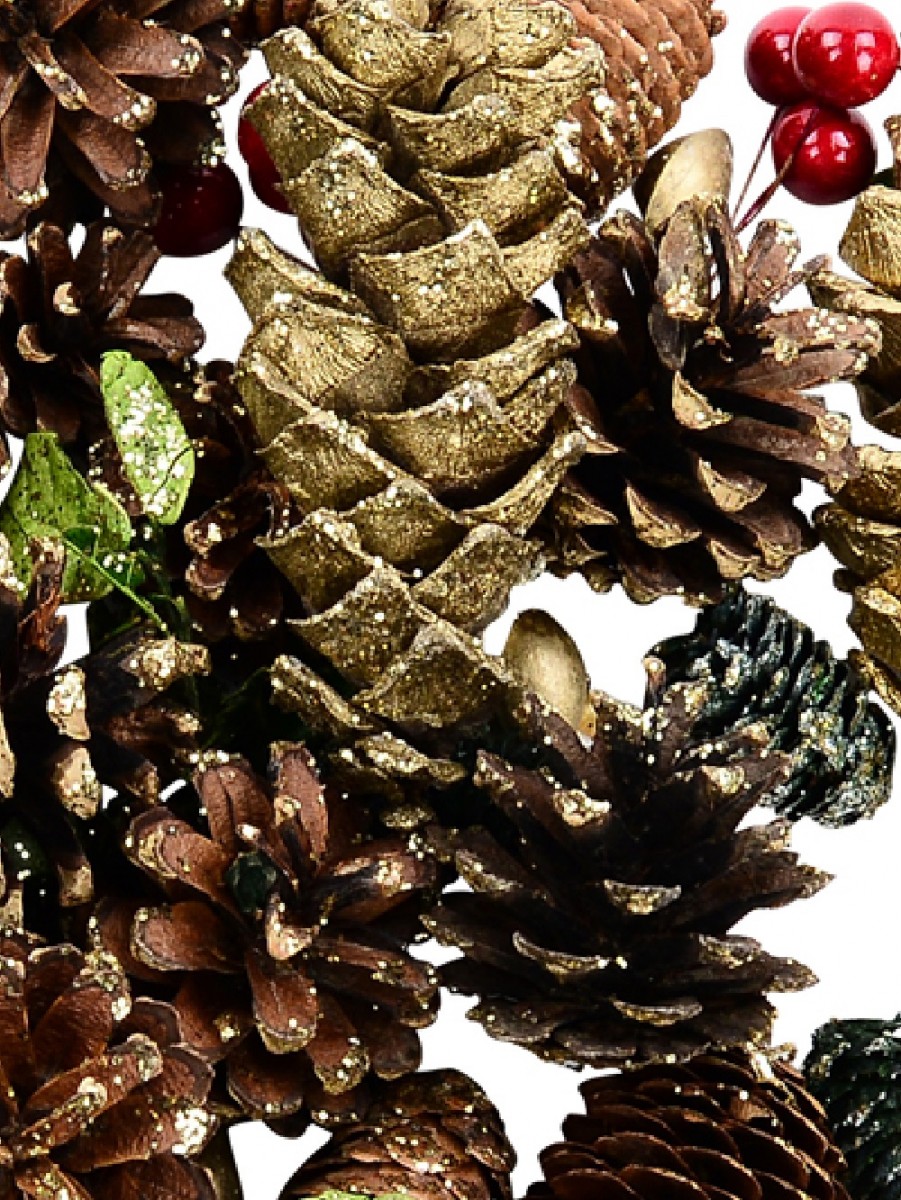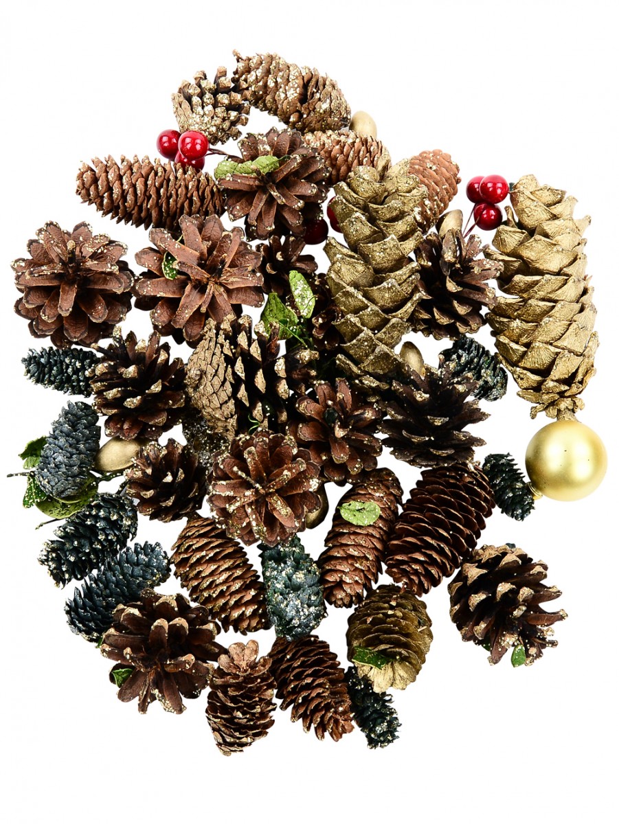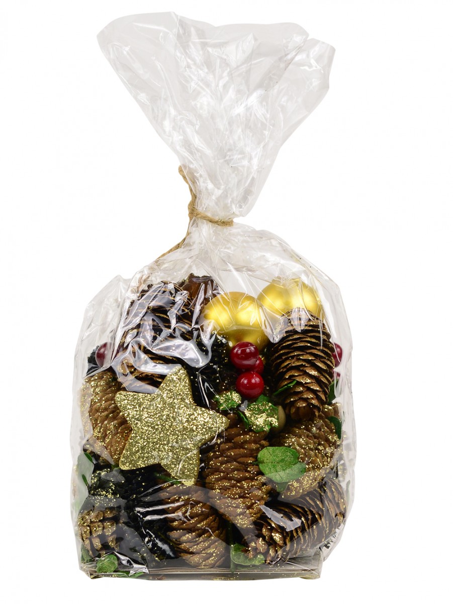 The Bag Of Assorted Decorative Pine Cones, Berries & Leaves is a cellophane bag containing various Christmas tree ornaments such as brown gold-glittered pine cones, glittered green leaves, green glitter long pine cones, bright red berries, glossy gold baubles and sparkling gold glitter stars. You get to be able to decorate your Xmas tree with all of these at such discounted pricing.