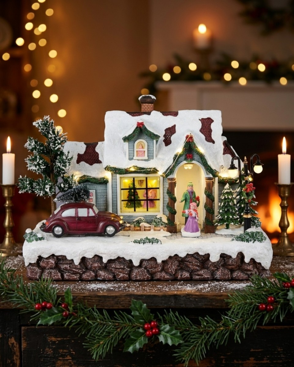 Capture the essence of a traditional holiday homecoming with this impressive 30cm Animated Musical Home For Christmas display. This meticulously hand painted resin ornament tells a beautiful story of a family celebrating in a snowy winter wonderland. Watch as Mum and daughter eagerly step out of the front door to greet Dad, who arrives in his classic VW Beetle with the new Christmas tree tied to the roof. From the big sister waving in the window, every detail brings the spirit of a festive lounge room to life