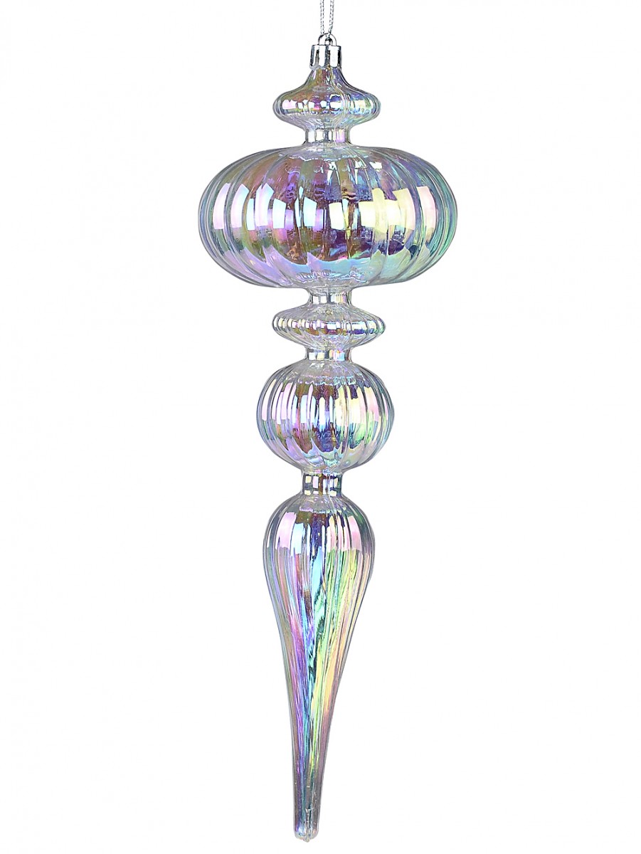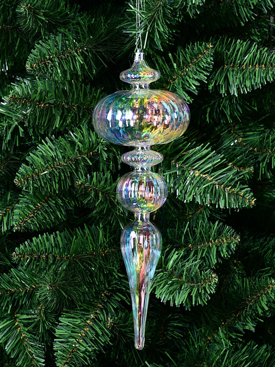 What makes it so magical is the clear iridescent finial. This picks up and bounces colours from every angle - making it look almost as if it's changing colour throughout the day or evening. Imagine a whole tree decorated in these radiant icicle ornaments, or how lovely they'd look as an accent with reds and golds on your table setting or Christmas garland. The vertical ridges are classic Christmas but also feel modern, and there's just something about the simple silver string that finishes the look.