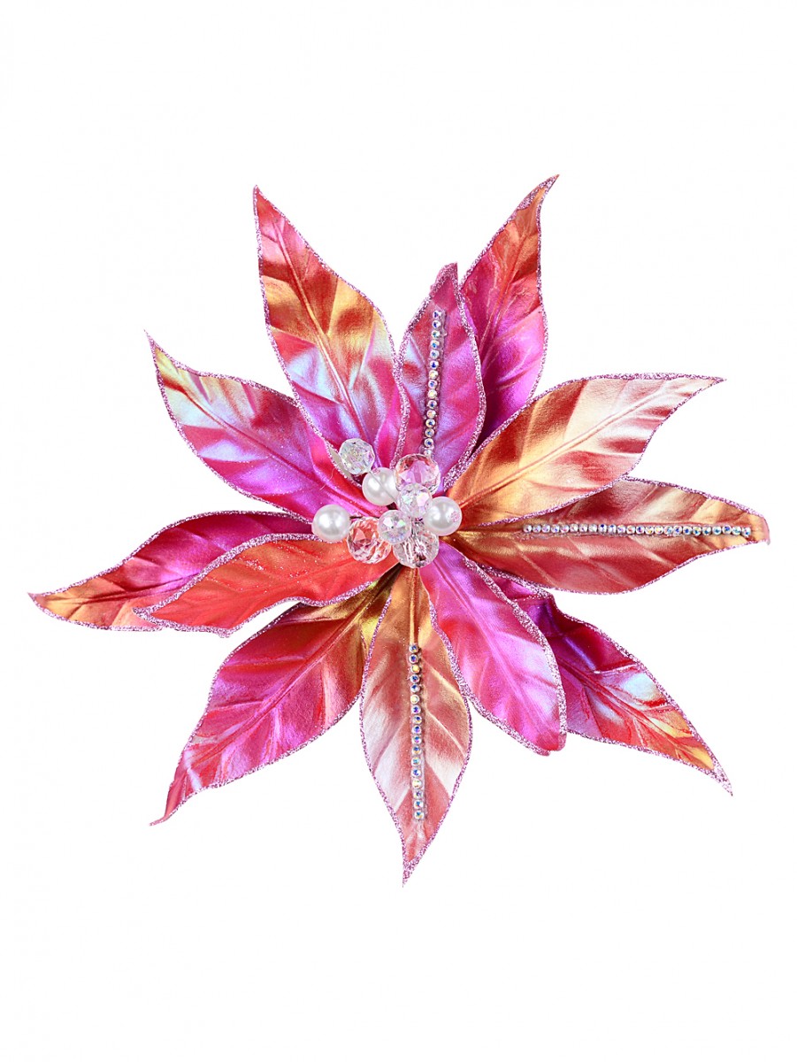 This isn't just your average Christmas flower clip. It's both dainty and dramatic, combining matte hot pink iridescent bracts edged with pink glitter and shimmering midrib diamantes. There are two petal styles that set it apart: one with glittery edges plus diamante lines, and the other, also edged in glitter but without the bling down the middle. We especially love that alligator clip on its 10cm stem for super easy decorating - great if you're using it in floral arrangements or bouquets too!