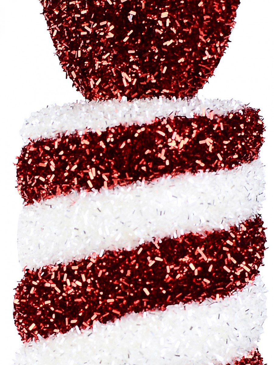 Standing at an impressive 34cm and measuring 14cm in width and 11cm in depth, this eye-catching ornament is designed to draw attention and complement your holiday decor effortlessly. Its intricate 3D candy swirl shape mimics a festive lolly, wrapped meticulously in alternating red and white bands. Each white band, delicately interspersed with silver tinsel flecks, adds a radiant, frosty sparkle that catches and reflects light from every angle, infusing any space with a magical glow.