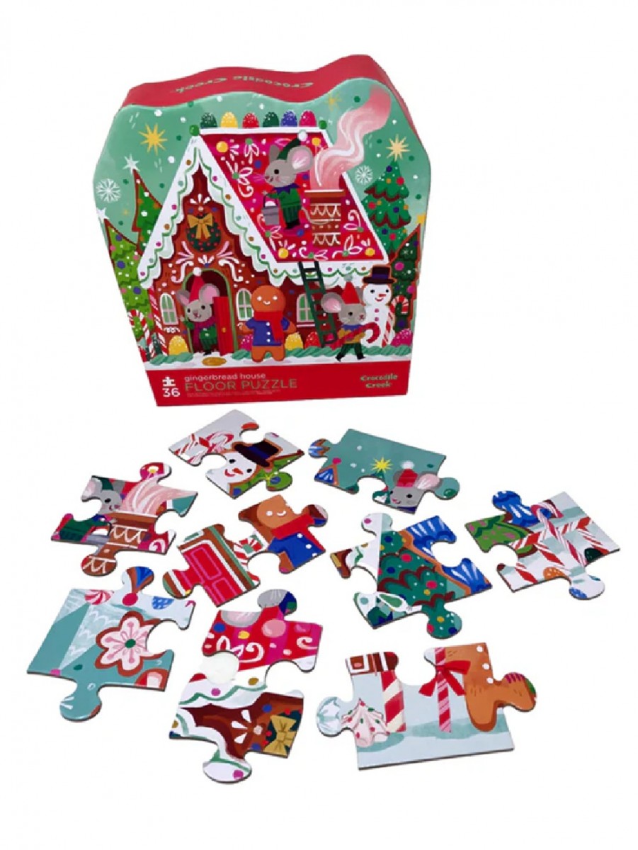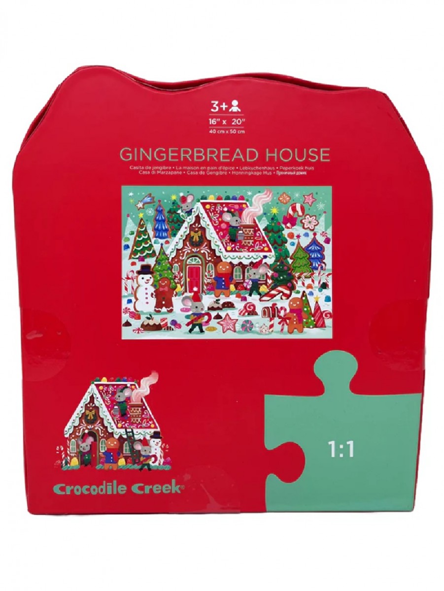 Is there anything more classic Christmas than a gingerbread house? Only this - our 36 Piece Crocodile Creek Gingerbread House Jigsaw Puzzle that features the happiest little gingerbread family and their sweet friends, the mice, decorating for their own Christmas in a forest of candy trees! This delightful floor puzzle is one of our favourite ways to get even very young kids involved in creating Christmas magic at home, and it can be used as everything from a calm playroom activity to pre-dinner entertainment on those busy festive days. Of course, the design is one hundred percent cheerful, colourful, and fits in easily with all the traditional colours and textures of holiday decorating. The big pieces are ideal for young hands and ages 3+, but every single member of our team has said they'd jump at a chance to help finish it! This Crocodile Creek puzzle comes in a perfect box for gifting or display - measures 40cm x 50cm, colour: N/A.