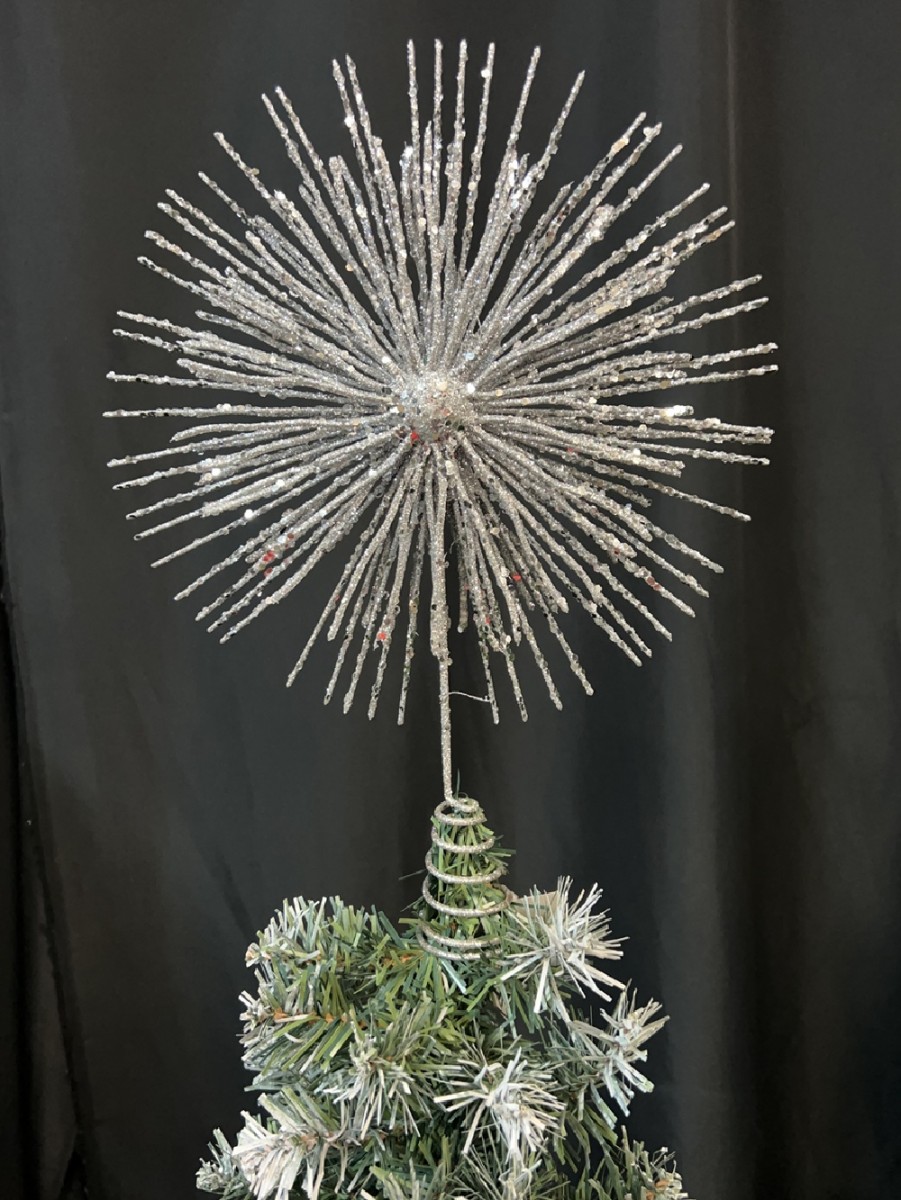 Add an extra special finishing touch to your Christmas tree with this silver glitter burst tree topper that is the perfect accompaniment to a traditional or modern tree and to any glittery snowy collections where silver takes the starring role. The design of this festive topper is similar to our gold glitter burst topper resembling a sparkler and will create a wonderful 'firework' effect when placed on top of your tree.