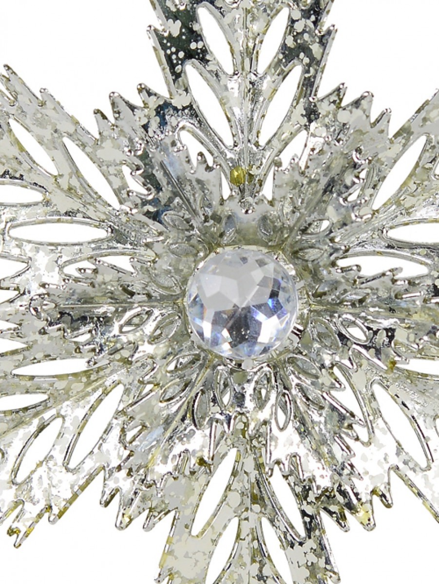 The smooth silver body of the snowflake has a slight sprinkling of silver glitter embellishments and makes it look more like a frozen snowflake giving it iridescent shine! It is a sturdy and good size for both large and smaller trees and will look especially nice on a flocked tree in a log cabin type house display. Consider hanging this on your kitchen window. It will be so pretty to see it the first thing in the morning when you get up to make coffee and look out at the bright sun or the several inches of snow on the ground!