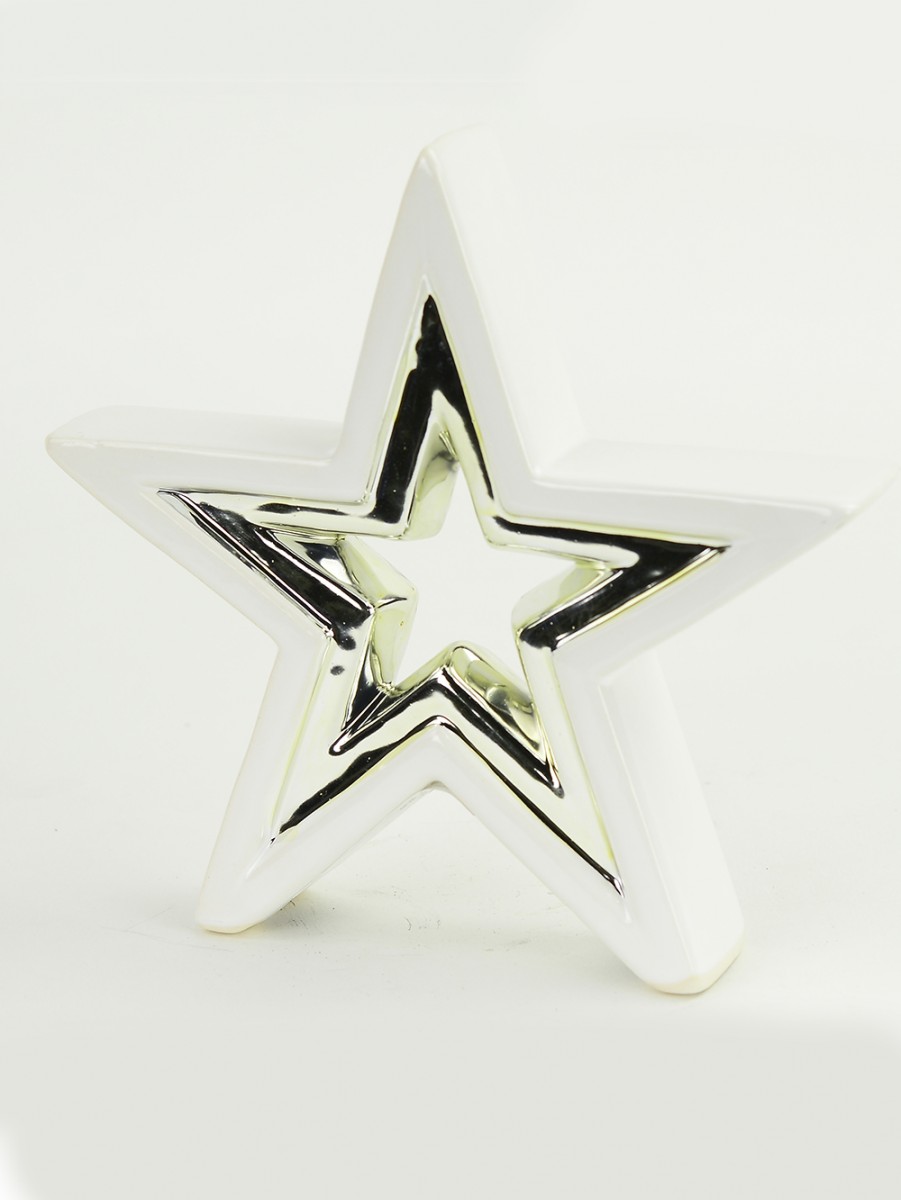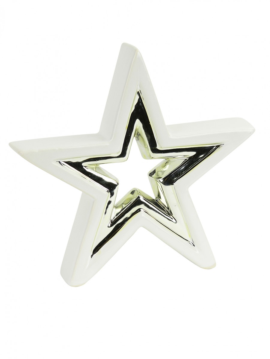 3D White Ceramic Star Ornament With Champagne Accent Stripe - 17cm