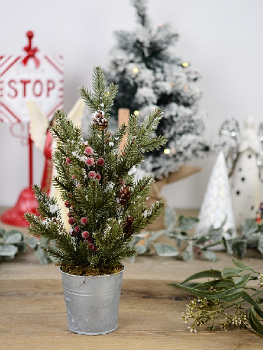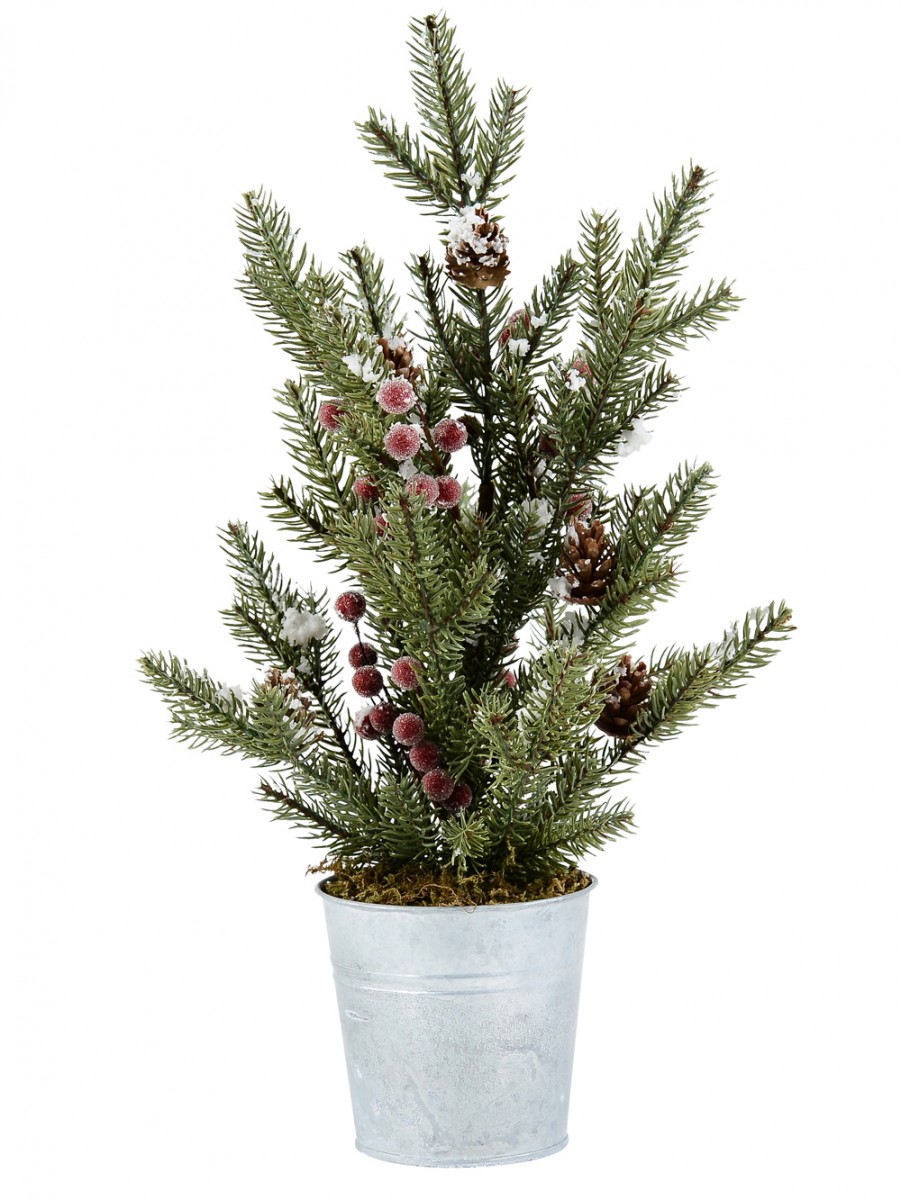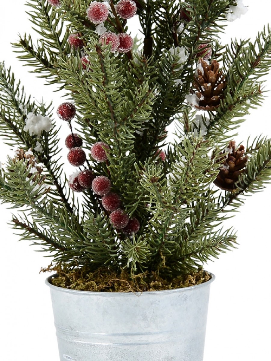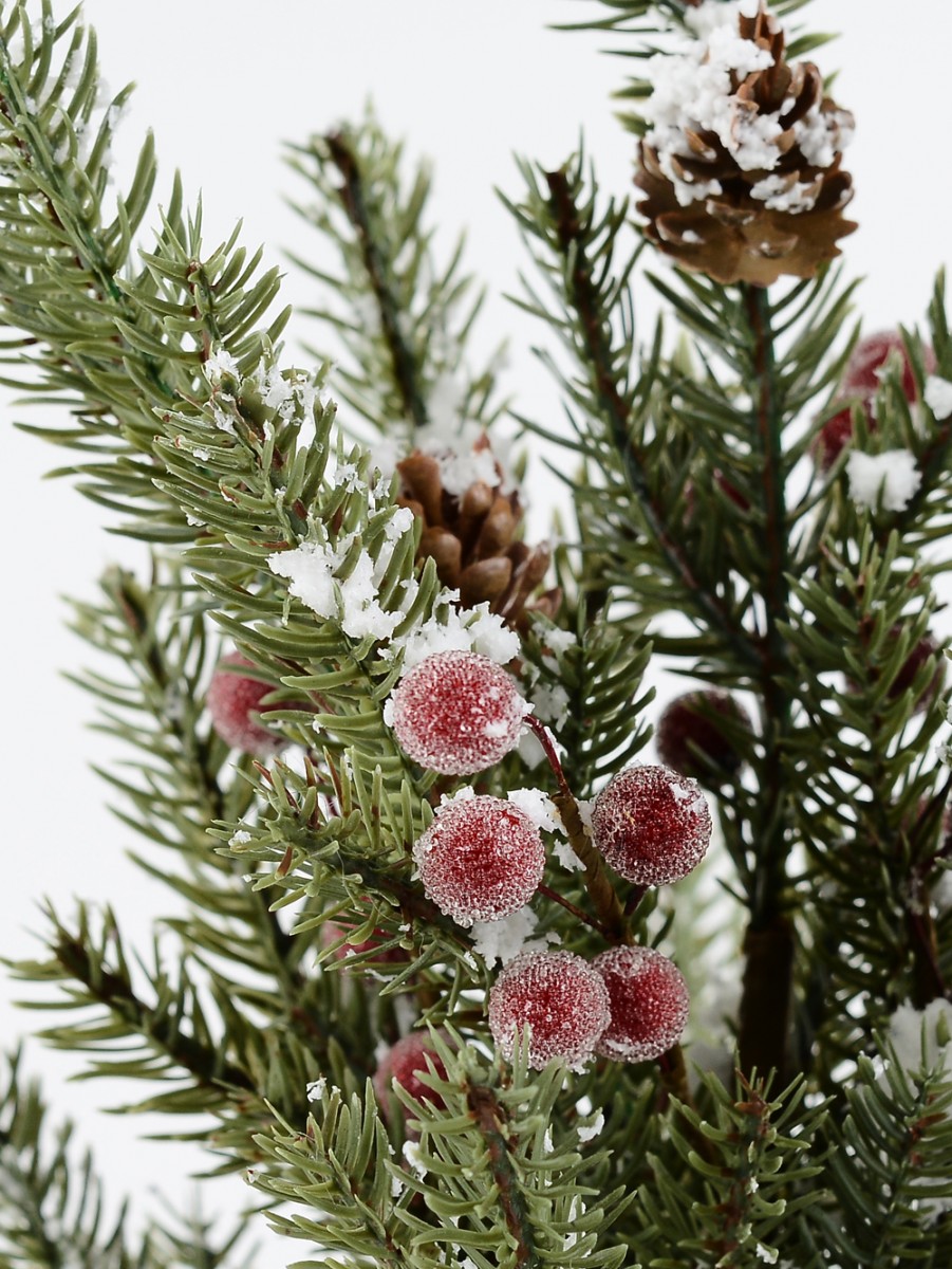 This delightful tree features lifelike foliage complete with small brown pine cones and vibrant red berries, all dusted with a frosty finish to capture the essence of winter. The brown twig branches add a rustic touch, while the green moss-look plant base and foliage, adorned with flocked snow spots, enhance its natural appeal. The tree comes with attached flexible branches, making fluffing and shaping a breeze. It includes a tin-look cylinder pot base, adding a touch of rustic charm to your holiday decor. Transform your Christmas dining setting into a captivating display by making this tree the centrepiece, surrounded by tabletop ornaments and decorations. To enhance its beauty, festoon the branches with bows, fairy lights, and a variety of ornaments to create a delightful texture and a heartwarming ambience.