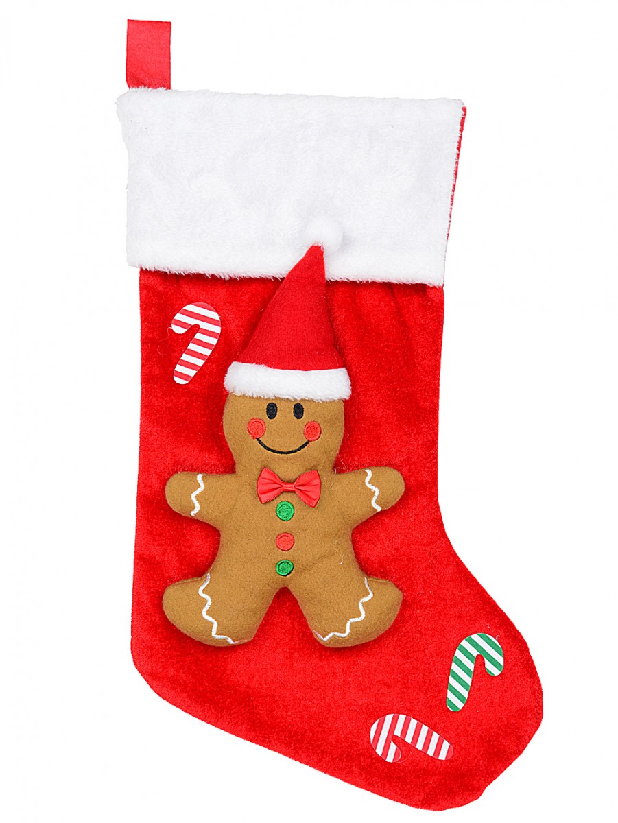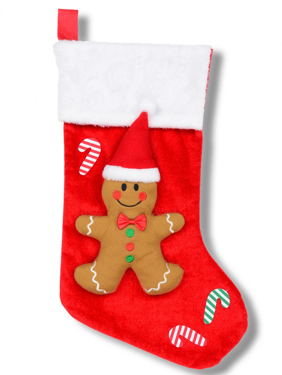 We adore its vibrant red colour, crisp white faux fur sock cuff, and that adorable 3D gingerbread man cookie face smiling out with rosy cheeks, festive buttons, and proper personality. Soft-to-the-touch and fluffy - the three-dimensional cookie is wearing a Santa hat and bowtie! Not to mention those striped red and green candy canes adding even more Christmas magic. Great for filling up with sweet little treats or just delighting everyone who passes by. Sold individually.
