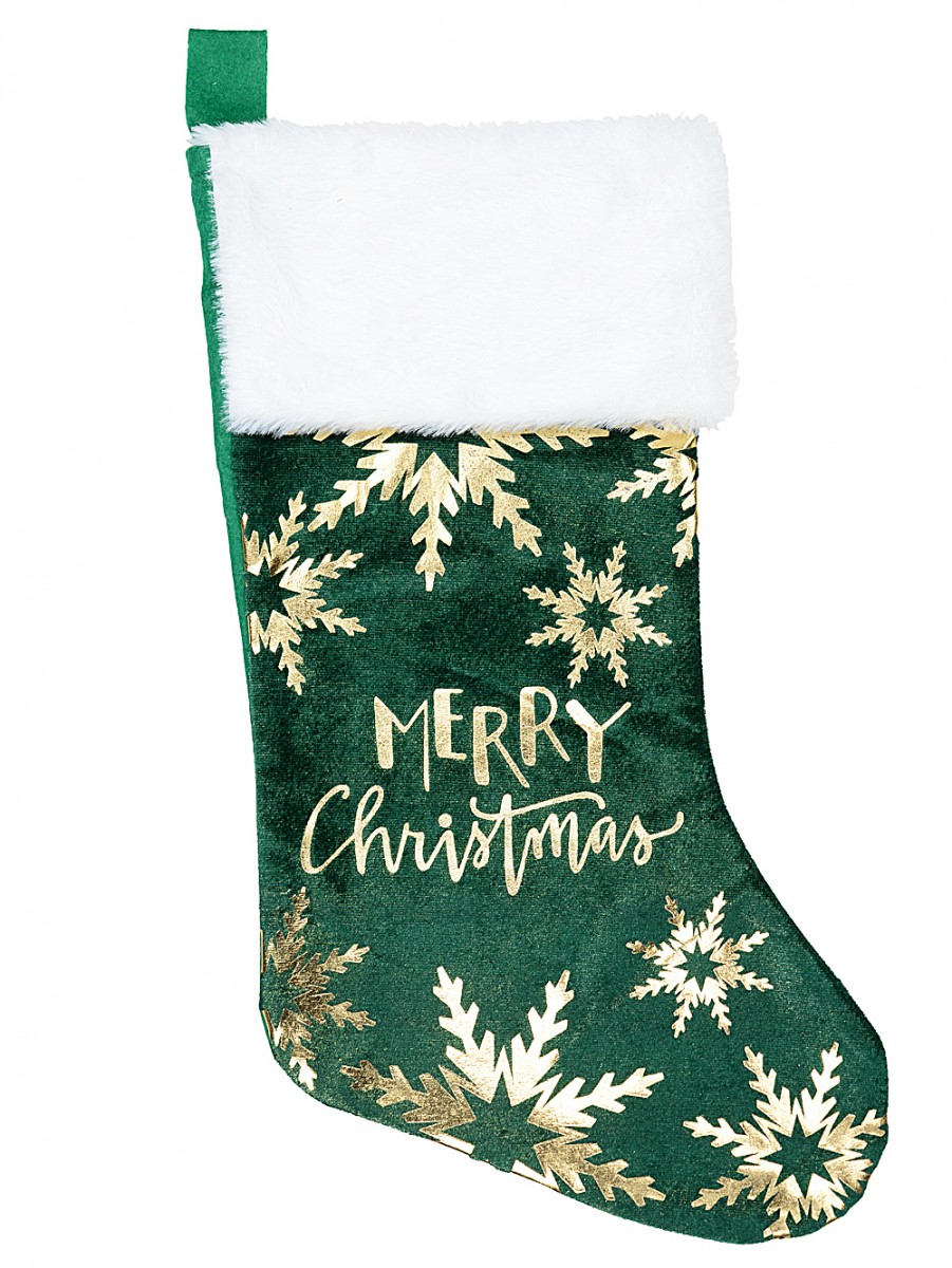The luxurious emerald green velvet looks so lush with its gold 'Merry Christmas' print and delicate snowflakes. It's a bit fancy, but not too much. Measuring 26cm x 45cm, it's generously sized - proper room for Santa's little surprises and treasures. We love how the soft white faux fur cuff adds a touch of warmth to the sparkle and shine. That green felt loop makes it easy to hang anywhere you want to bring in holiday cheer.