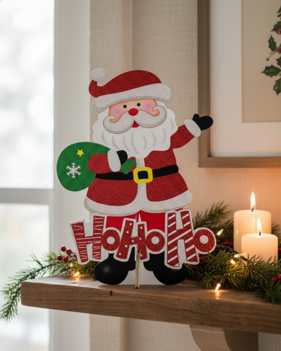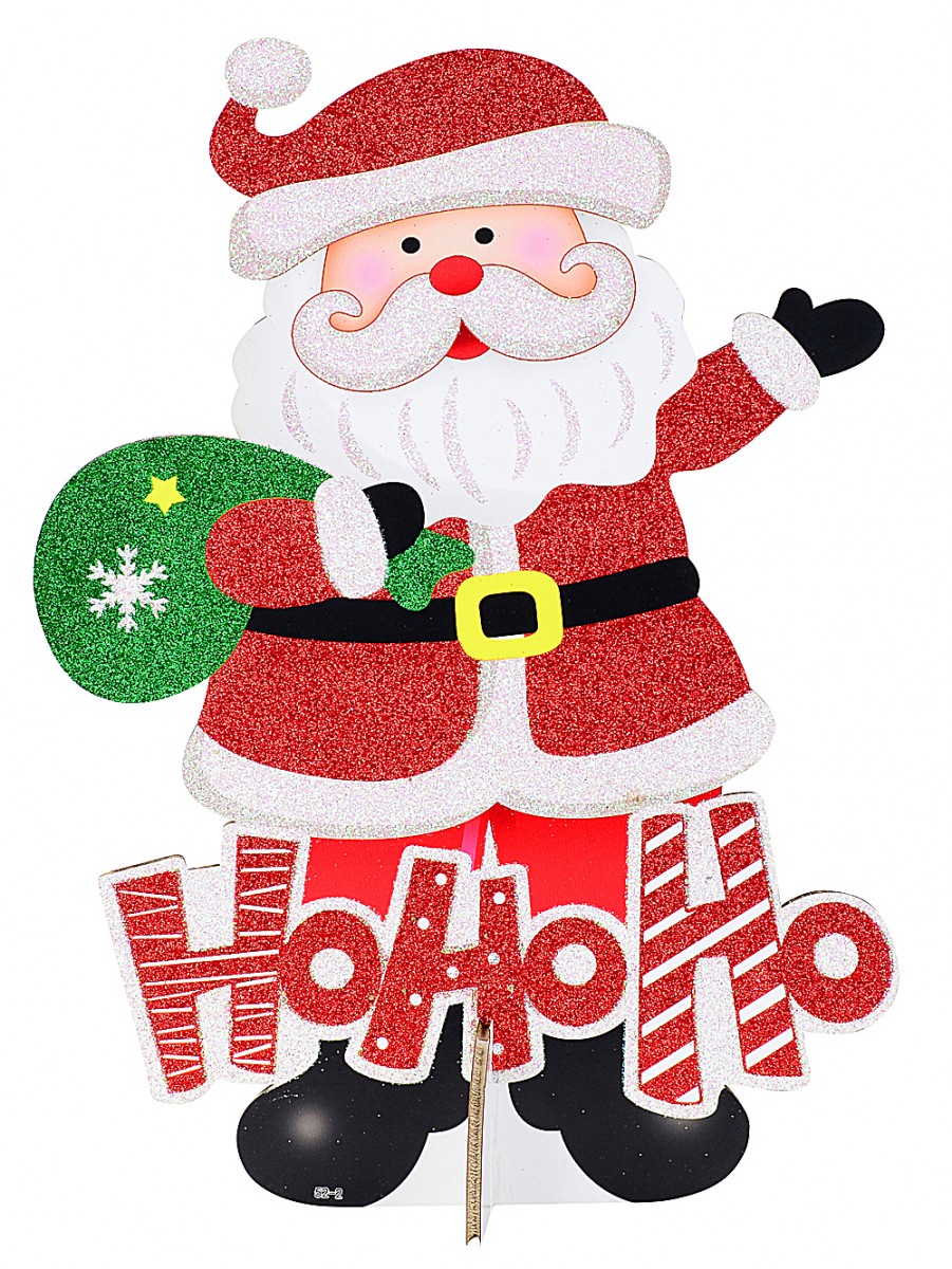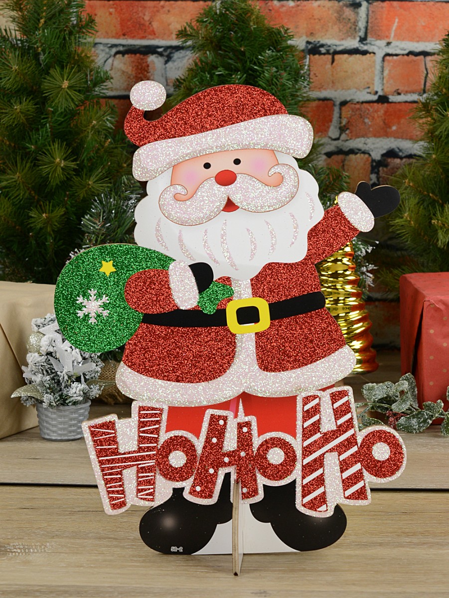 Standing 34cm by 46cm, this jolly Father Christmas in his red and white suit is ready to wave in the holidays with a big green sack over his shoulder and “Ho Ho Ho” sparkling at his feet. He's decked out in glitter - on his hat, jacket, beard, sack and those brilliant stripy letters - for that extra festive pop. It's lovely next to ornaments, lights or nestled amongst garlands of pine.