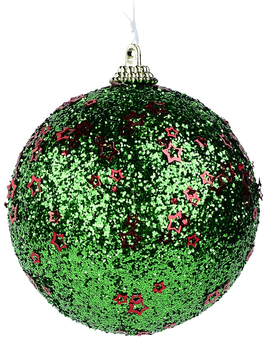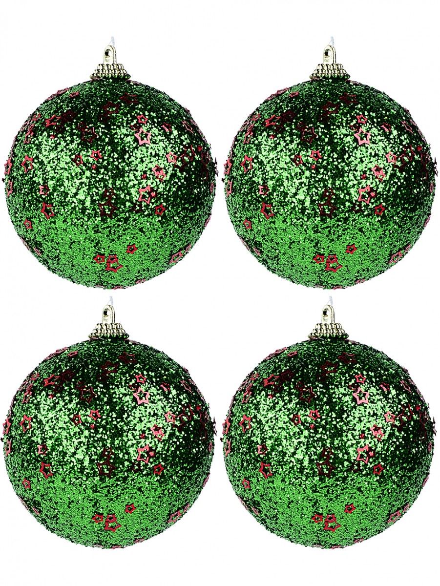 Each bauble in this set exudes a lively festive charm, featuring a vibrant green coating enveloped in metallic glitter. The baubles are further adorned with delicate red stars in varying sizes, making them a captivating addition to your Christmas tree. The contrast of the green base with the shiny hollow star flakes ensures they catch the light beautifully, creating a dazzling display that enhances the warmth and spirit of the season.