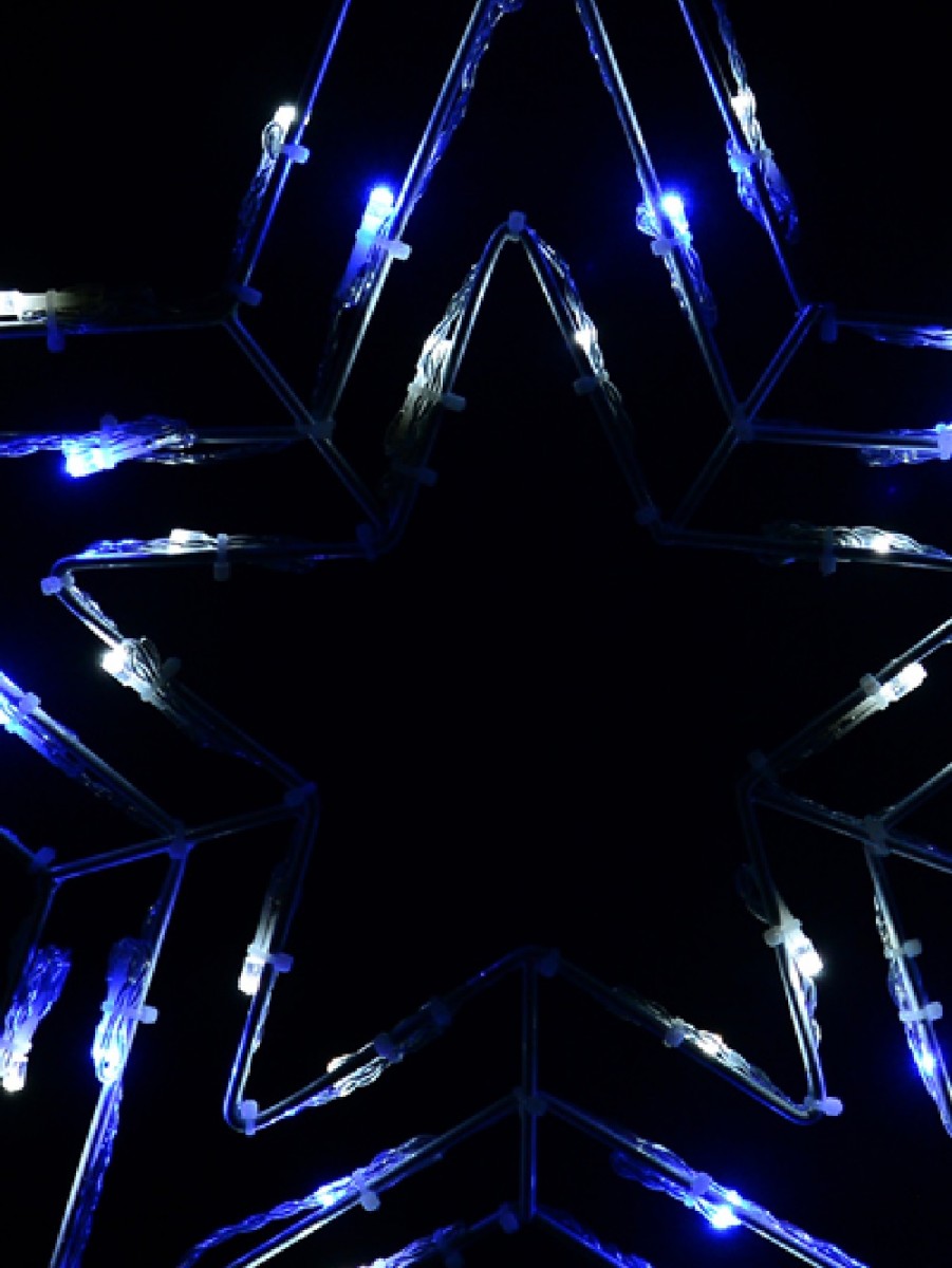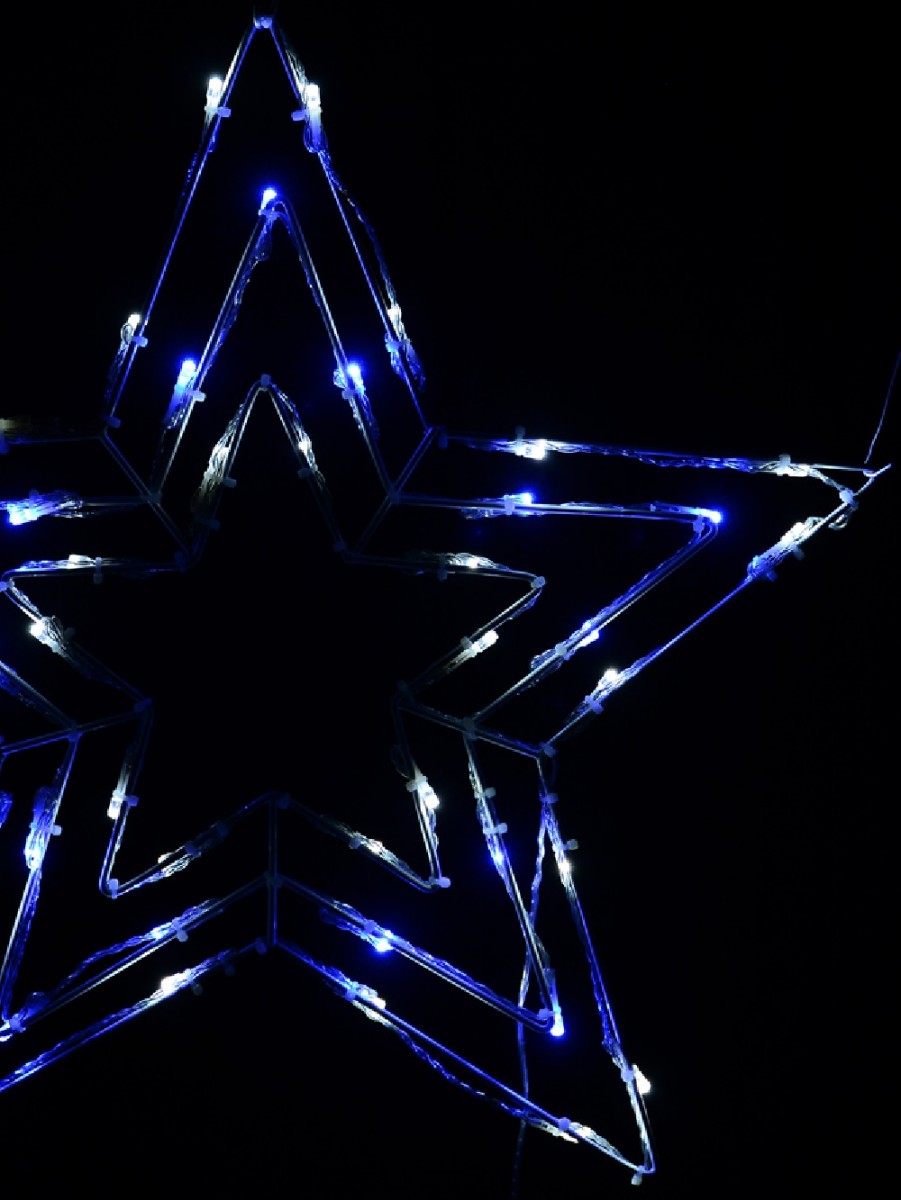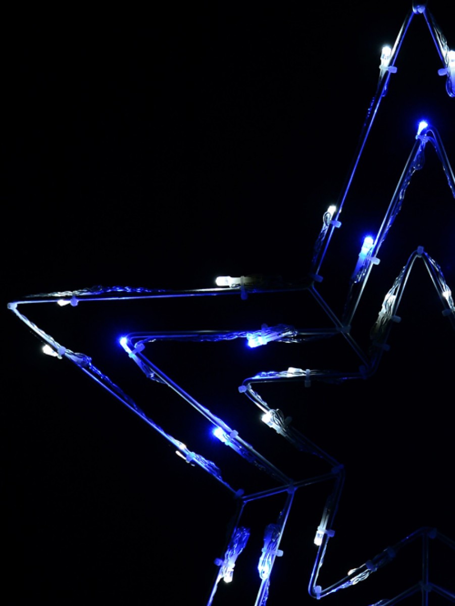 Featuring 45 alternating cool white and blue LED concave bulbs, this beautiful triple star motif radiates a captivating glow that beautifully balances the serenity of cool white with the vibrance of blue. Mounted on a sturdy frame for effortless display, the light strings create a perfect silhouette that shines brightly both day and night. With a 50mm bulb spacing and a generous 5m lead, setup is straightforward and flexible, allowing for various creative placements in and around your space.