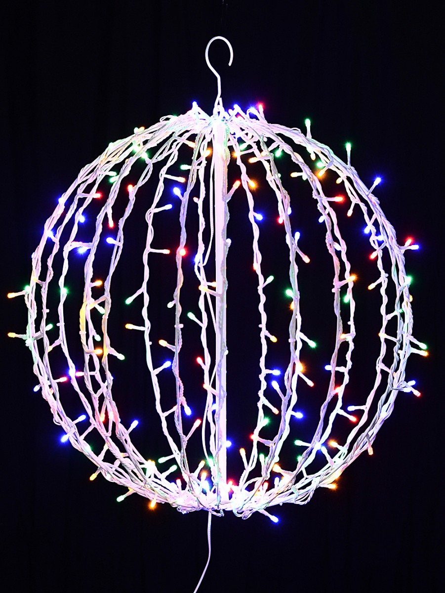 Introducing a white sphere with a 3D cage-like structure composed of thin vertical metal bars that run from top to bottom, creating an intricate and visually appealing design. The best part is how the vertical metal bars are illuminated with vibrant coloured bulbs to create a colourful lighting effect.