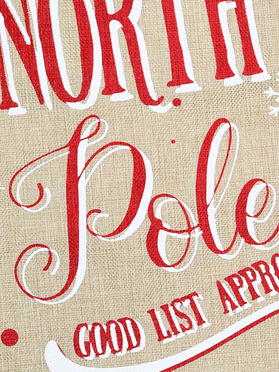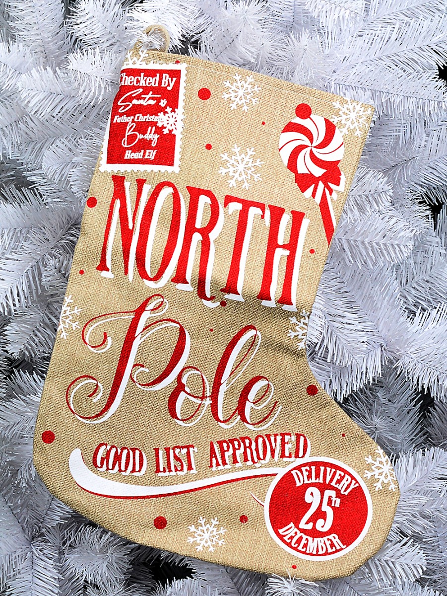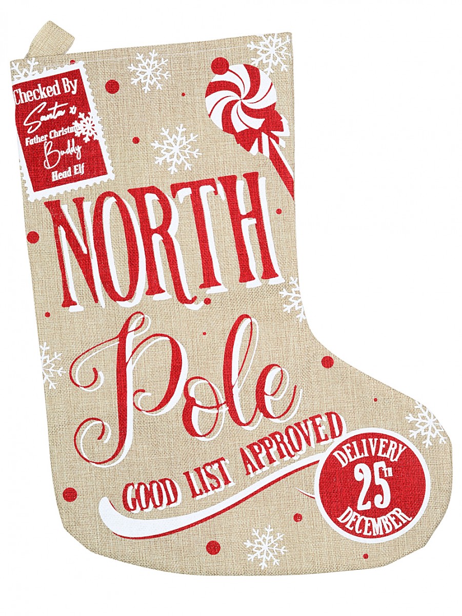 Measuring 36cm x 50cm, this stocking is designed in an endearing 'Red & White on Natural' colour scheme. It features a beautiful jute texture adorned with festive red and white prints and various seasonal images and text. The sizeable stocking proudly showcases the words 'North Pole' and 'Good List Approved', highlighted by an underline that subtly accentuates its importance. The design includes a confirmation check stamp signed distinctly by Santa (Father Christmas) and his trusty Head Elf, Buddy, adding a personal touch of authenticity and charm.
