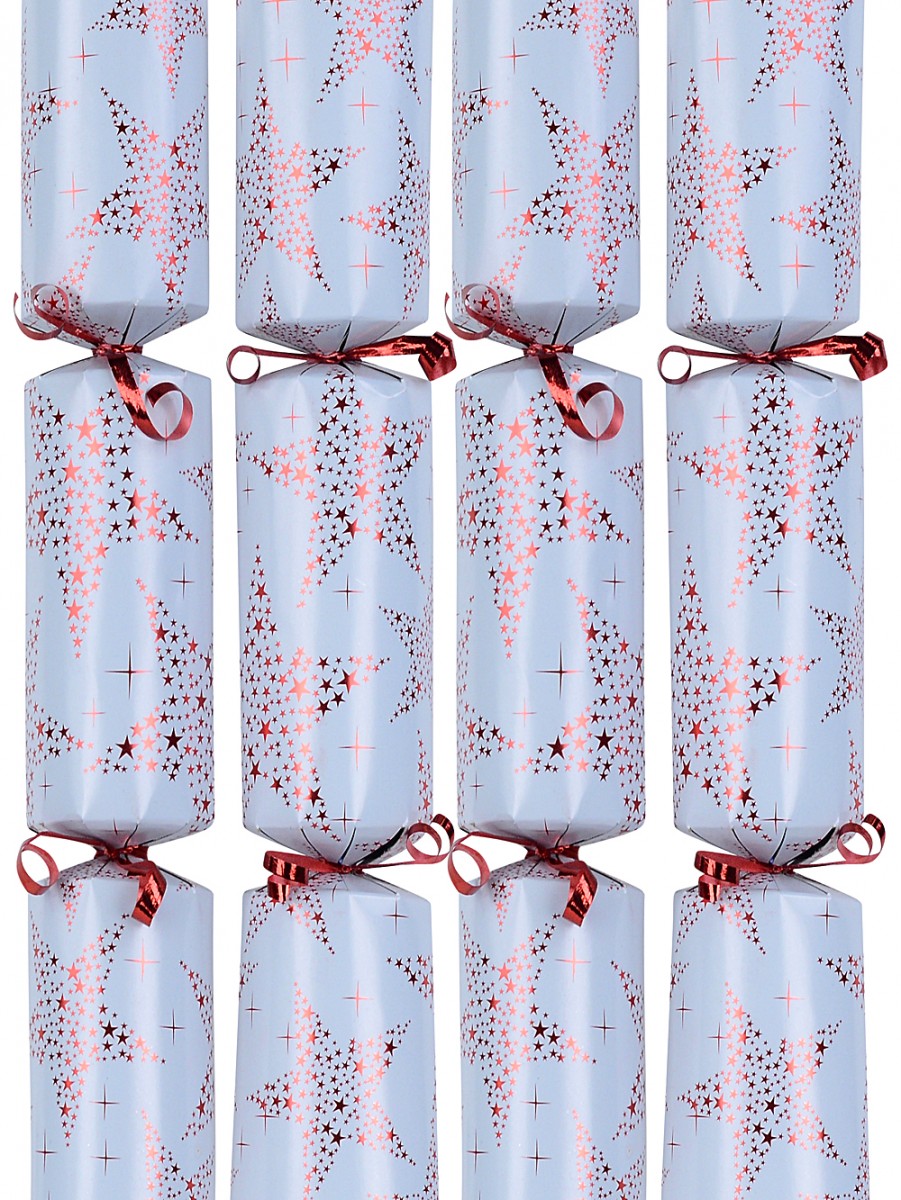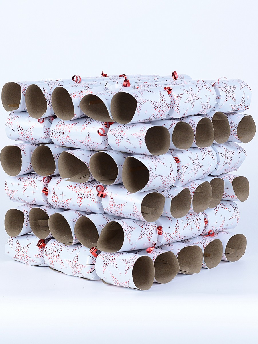 Crafted with meticulous detail, each cracker features a captivating red star pattern on a pristine white background, capturing the essence of holiday cheer. The design is further accentuated by shiny red ribbons at each twist, sealing the bonbon contents and adding a touch of sophistication. Sold in a convenient bulk pack of 50, these crackers are ideal for large gatherings or keeping a festive spirit alive throughout the holiday season and beyond.