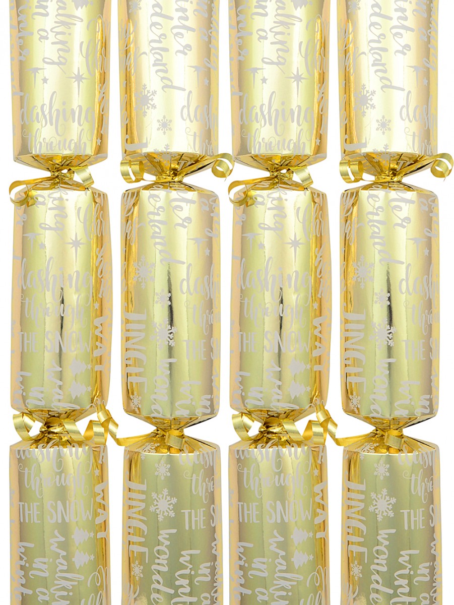 And these are not just beautiful to look at - they really bring the family together as you all gather around to pull them together and see what little surprise you get. Each bonbon includes a fun gift, paper hat, snap, and joke so everyone feels included and entertained as you enjoy your meal together! These come in a pack of 50 so you will definitely have enough for all your guests. The metallic gold body has white text in various fonts with words like �Jingle all the way� �Merry Christmas�, and �Walking in a Winter Wonderland� - all decorated with little snowflakes that glimmer in the light. Each cracker measures 55mm x 55mm x 30cm. And if you have some left over (which rarely happens) - you can always use them for New Year's or save them for next year.