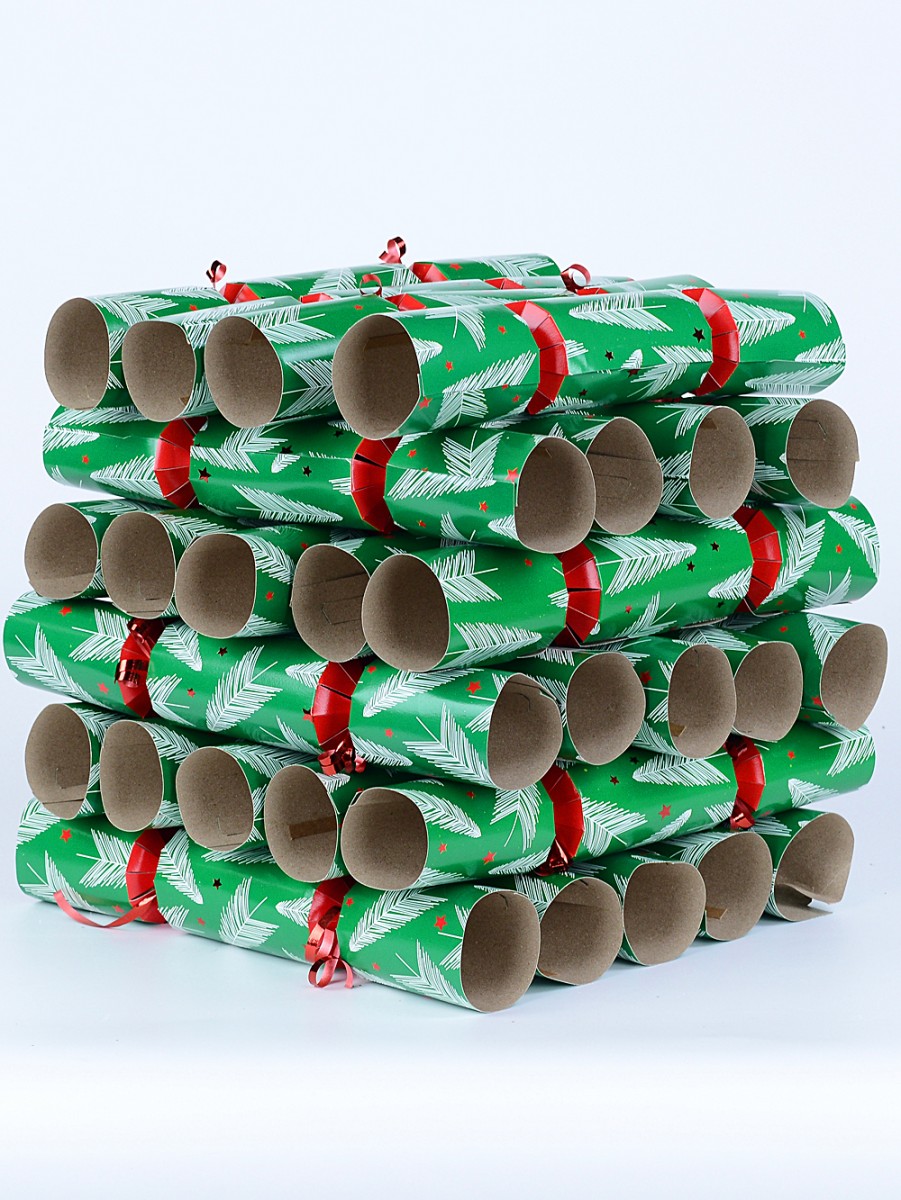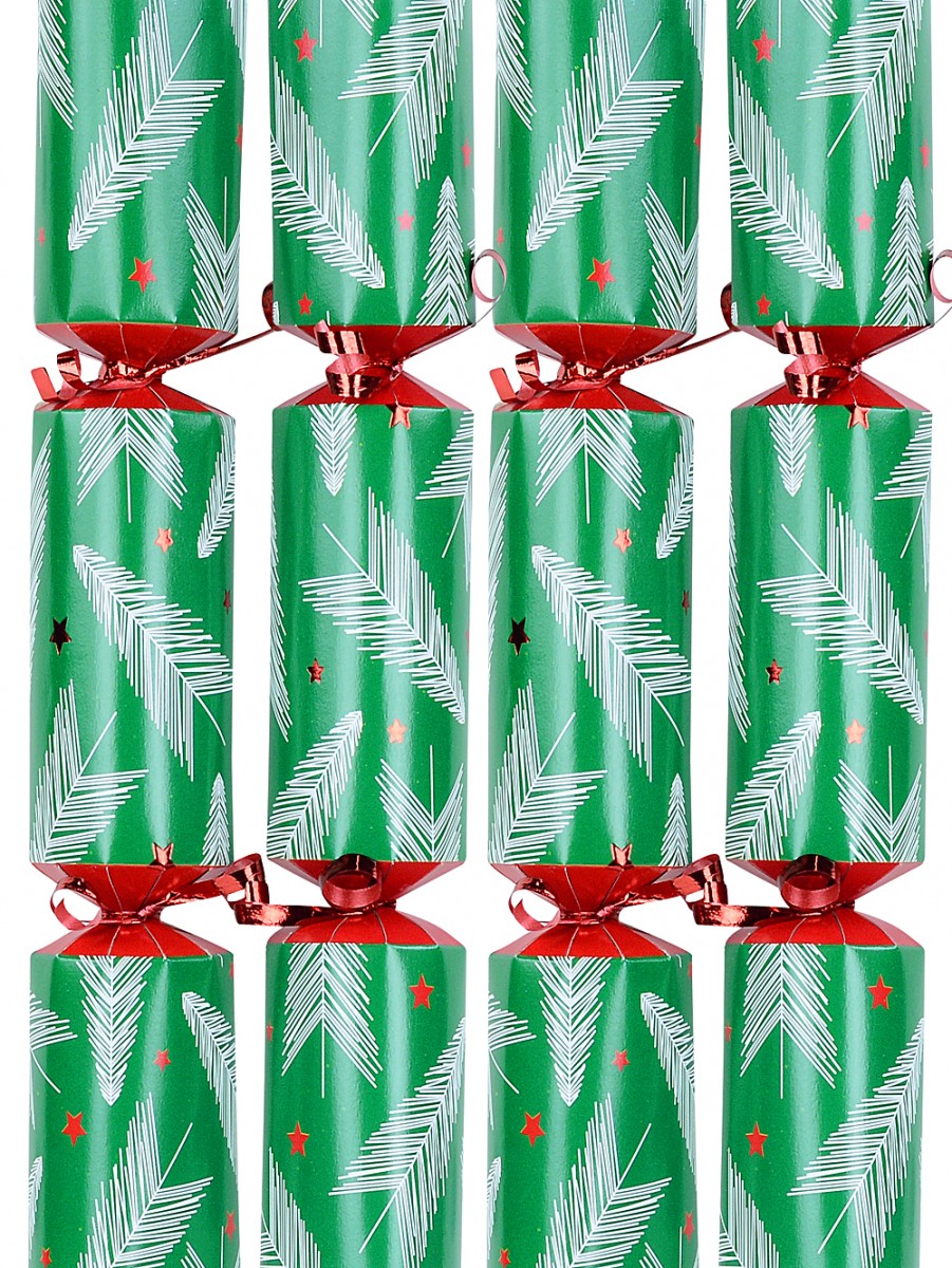 The crackers' enchanting design features a vibrant green backdrop adorned with a delightful pattern of white pine trees and shiny red stars. This classic combination of colours evokes the warmth and joy of the holiday season. Sealed with a shiny red ribbon, each cracker not only enhances visual appeal but also holds delightful surprises. The contents include a traditional snap, a small gift, a festive hat, and an amusing joke to entertain guests during holiday gatherings.