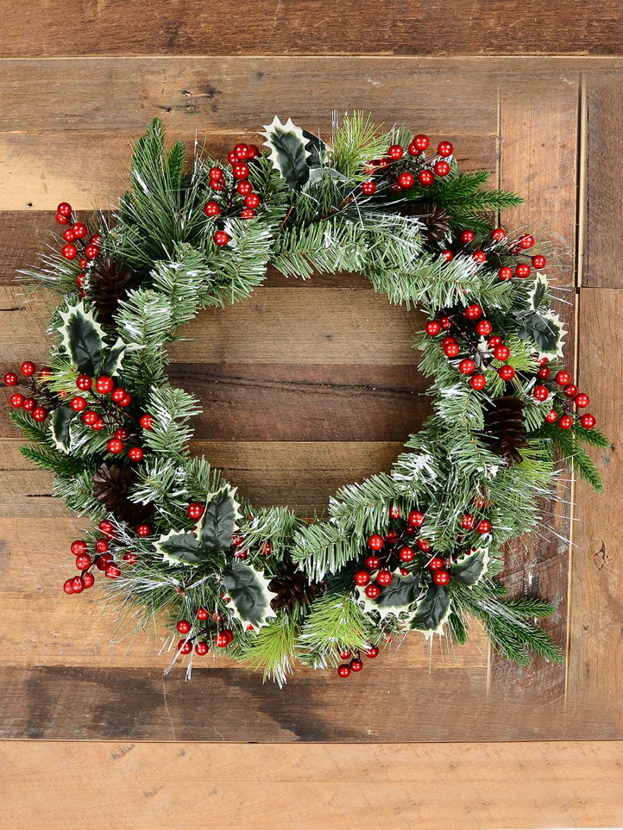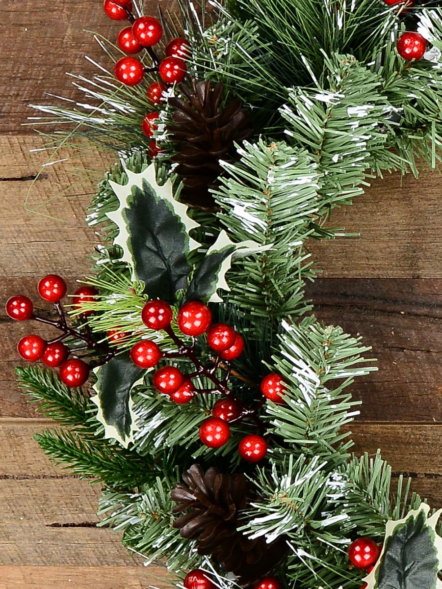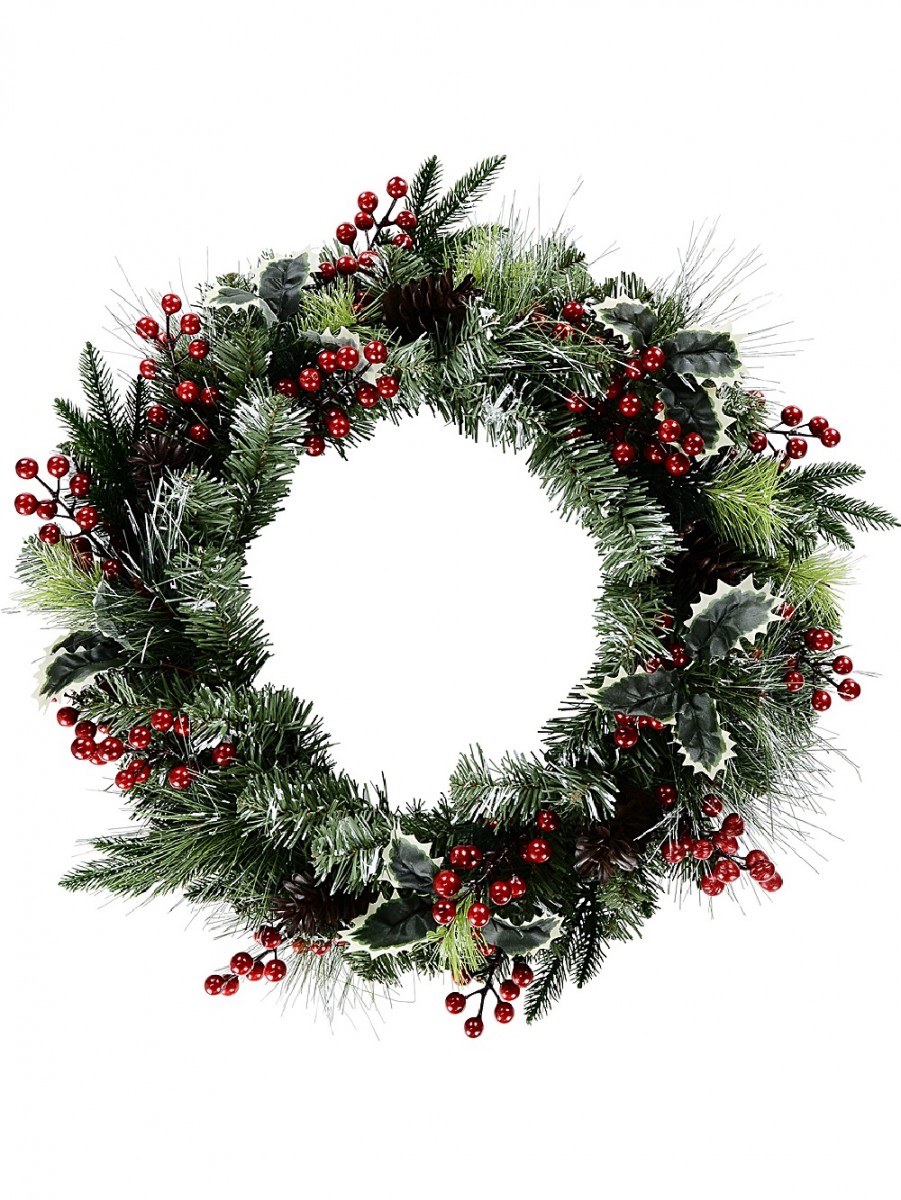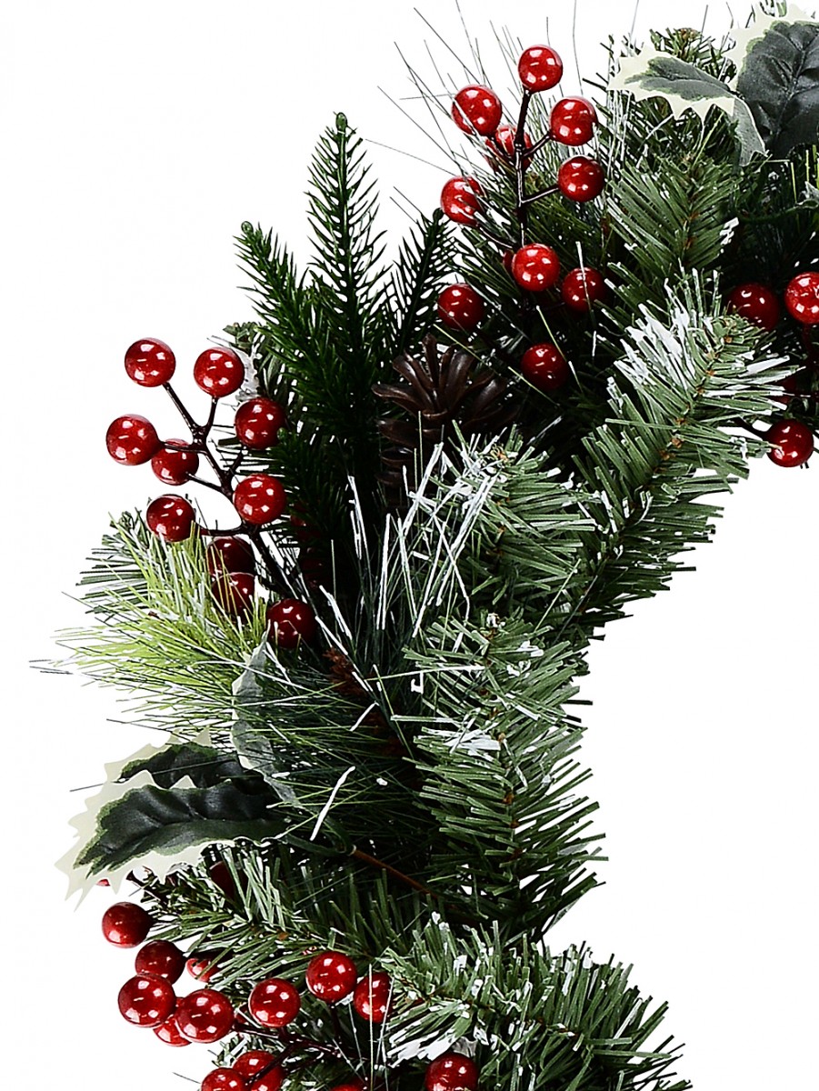 This wreath brings a touch of timeless greenery to your home during the holiday season. Its lush green foliage of dark green pine tips and fir needle tips with long and short tips provide a realistic texture and ample volume. To enhance its wintry charm, the wreath is adorned with sporadic white snow spots, adding to its overall visual appeal. The wreath is further embellished with PVC 3-leaf holly bunches, red berry branches, and brown pinecones, which enhance its festive and Christmassy appearance. Whether you choose to hang it on your front door, over the fireplace mantel to create a cosy atmosphere, use it to adorn your Christmas tree, or as an elegant centrepiece for your table settings, it breathes a refreshing and seasonal touch.