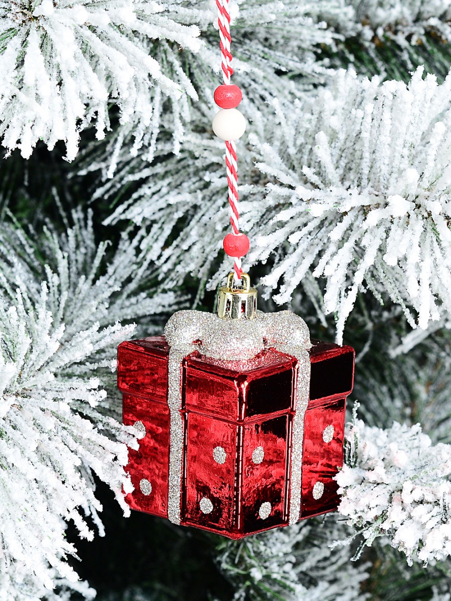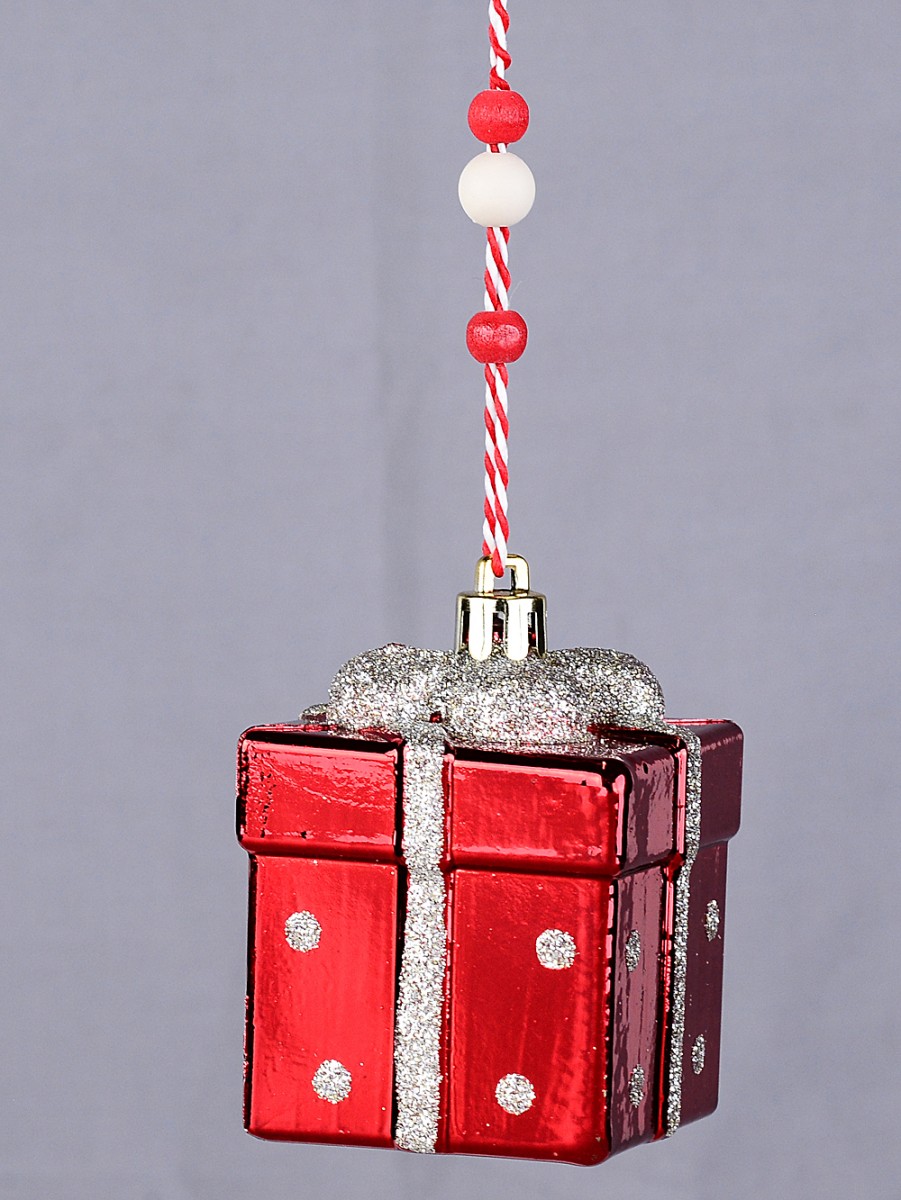 It's shaped like a cheerful little gift box, measuring 55mm x 55mm x 60mm, with a shiny red colour that just shouts Christmas. And the glitter ribbon detailing - silver, sparkly, and so inviting - it wraps the whole ornament and even forms a bow on top for that classic look. The silver dots are a really sweet touch. It reminds us of those beautifully wrapped presents under the tree as kids.