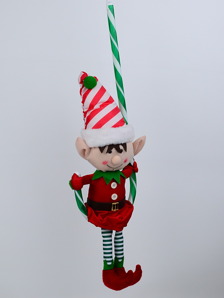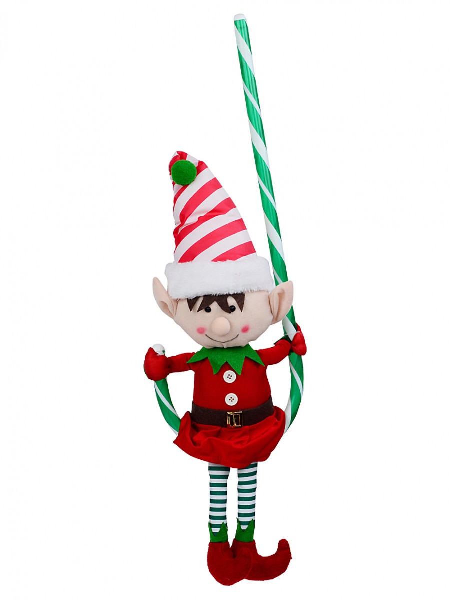 The elf himself is a lovely 54cm tall, all soft and padded for that huggable look. The candy cane has an easy-to-hang nylon loop at the tip - so you can have your new friend peeking out from the porch or swaying in the living room. And we think he looks magical on an outdoor wall or business entryway! It’s real Christmas cheer brought to life, matching perfectly with traditional red and white colour schemes. Might go best to keep him indoors during very wild weather though. Our elves love Christmas, but they don’t like hail!