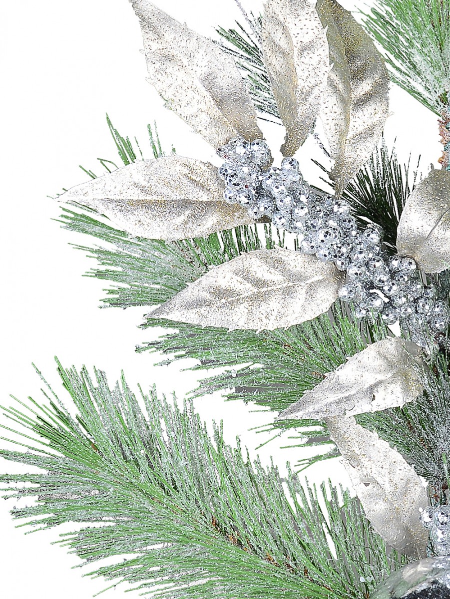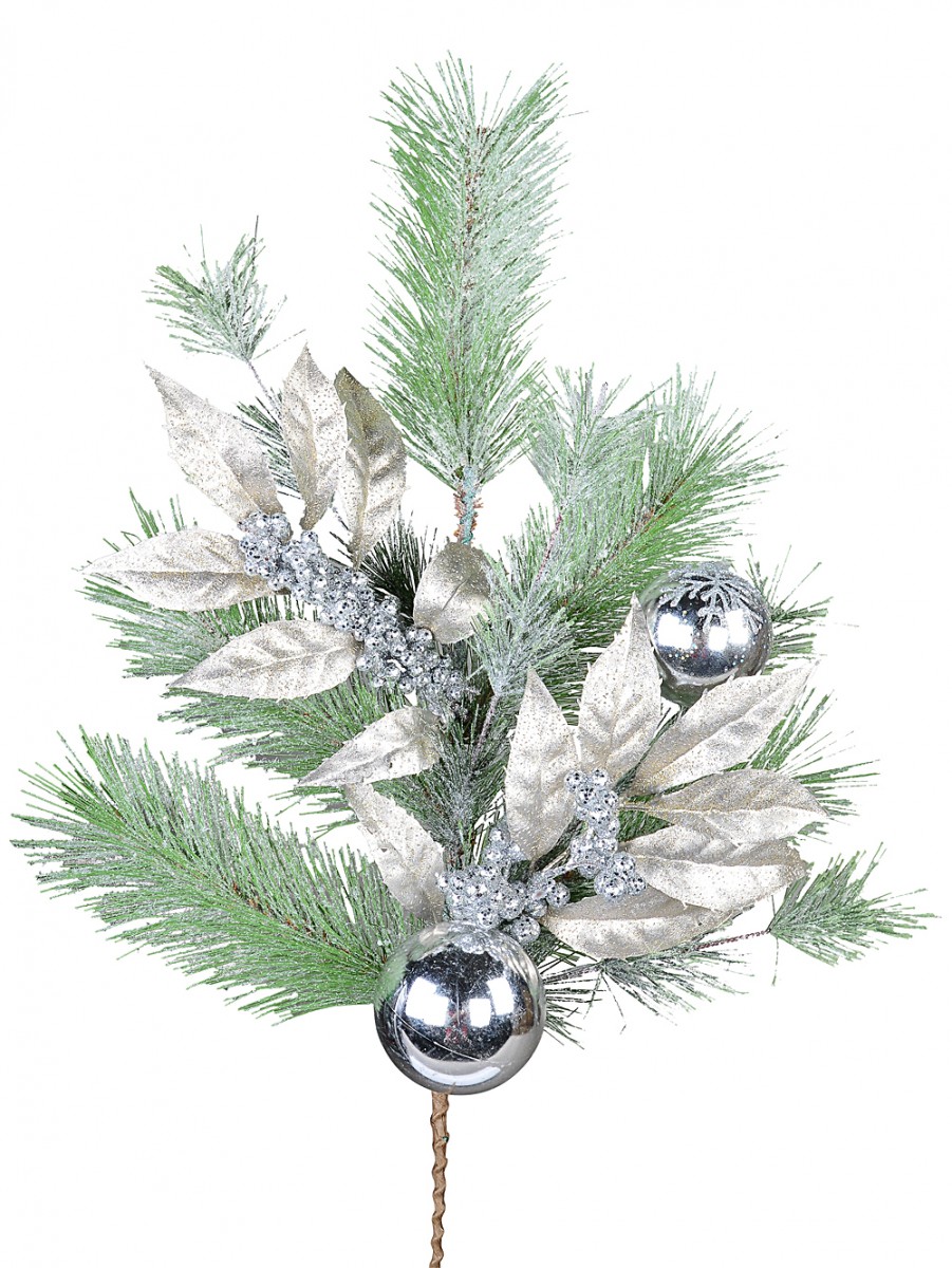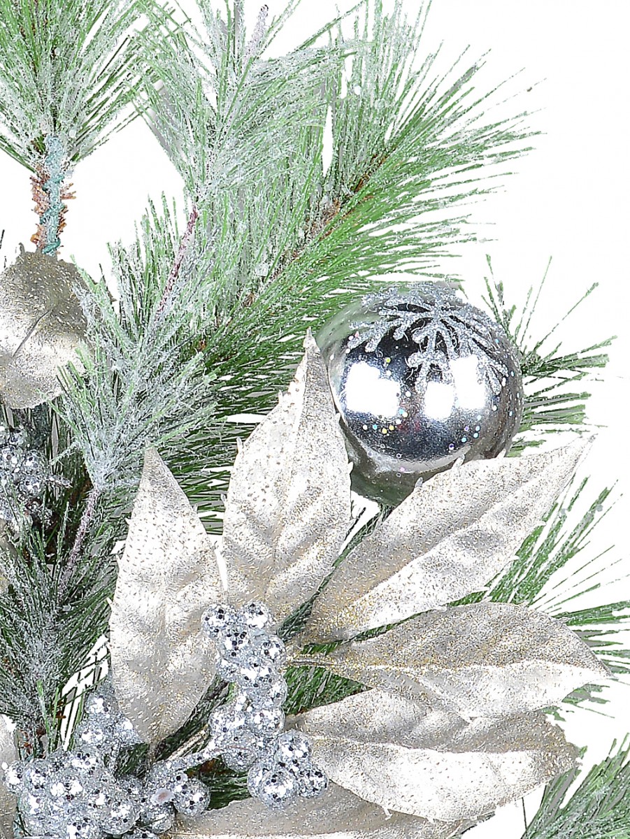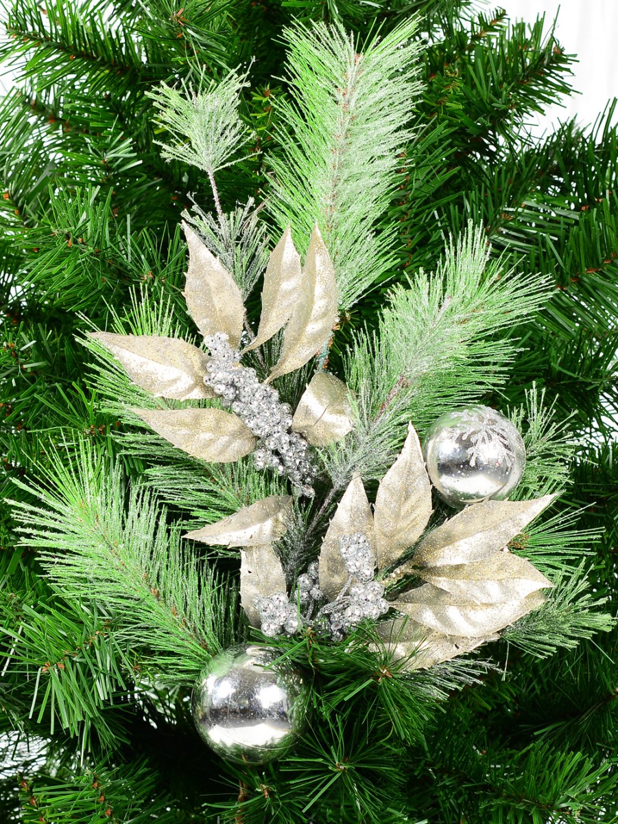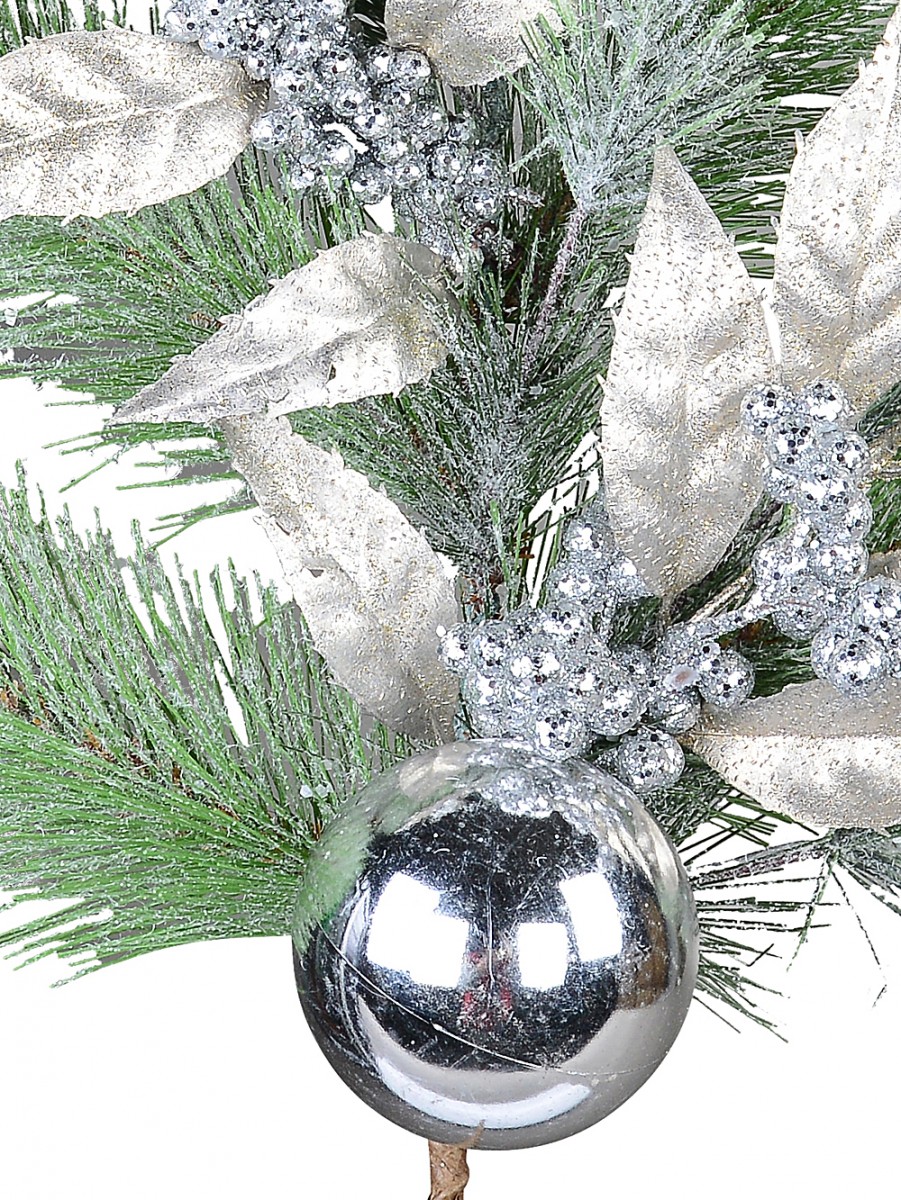 Silver Berries, Glittered Leaves & Baubles Decorative Christmas Pine Stem will give your Christmas tree, wreath and garland the illusion of a snow-covered frosty scene. This winter-inspired beauty will not only look mesmerizing tucked beautifully into your Christmas tree, but it will also complement the interior design aspirations that you might have. The gold leaf lights up the spark of this Christmas stem and makes it more alluring. Did I mention that Silver Berries, Glittered Leaves & Baubles Decorative Christmas Pine Stem make a bold and lively addition to the flower arrangement in your living room, bedroom, or dining?