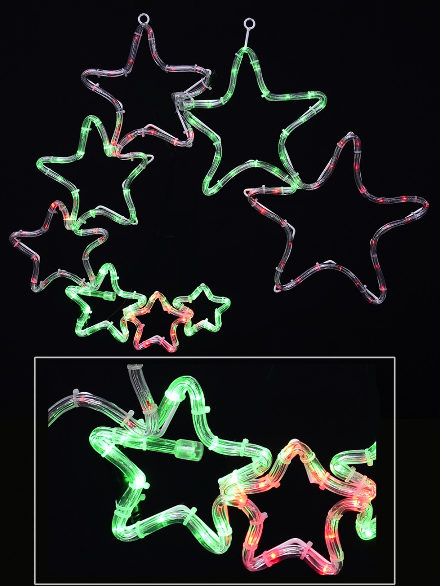 Try out our 8 Red and Green Stars Ring Rope Light Silhouette that will make your lighting display sparkle with 8 different special effects including still burn to choose from. The 74cm x 58cm colourful starry motif is compatible for indoor and outdoor use so it is great for all displays from placing in your yard, along fences to hanging on your windowsill or balcony.