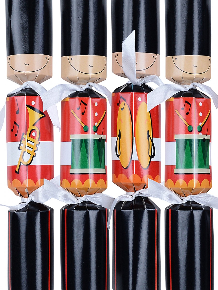 Imagine the joy on your guests' faces as they discover the intricately crafted drummer boy, the lively cymbalist, and the buoyant trumpeter, each donned in a striking red and white suit. With nutcracker heads topped with bearskin caps and boots on the handles, these crackers exude festive charm and elegance. Sealed with white ribbons, each cracker promises a delightful surprise, containing a whimsical hat, a cheerful whistle, and a witty motto, sure to bring laughter and joy to your holiday gatherings.