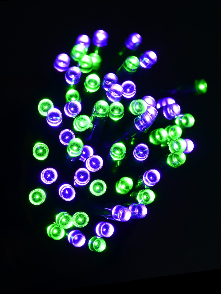 This Green & Purple LED String Light adds a futuristic, vibrant and definite eye-catching sparkle of bright, bold colours to both indoor and outdoor spaces for Christmas, New Year, celebrations or just about all other special events. Modern, attractive and very striking, put these bright and glittering lights up at outdoor patios, balconies, gardens or lawns, drape them over mantels, countertops or tables, or hang them in halls, family rooms or windows to really pop with vivid purple and green illumination.