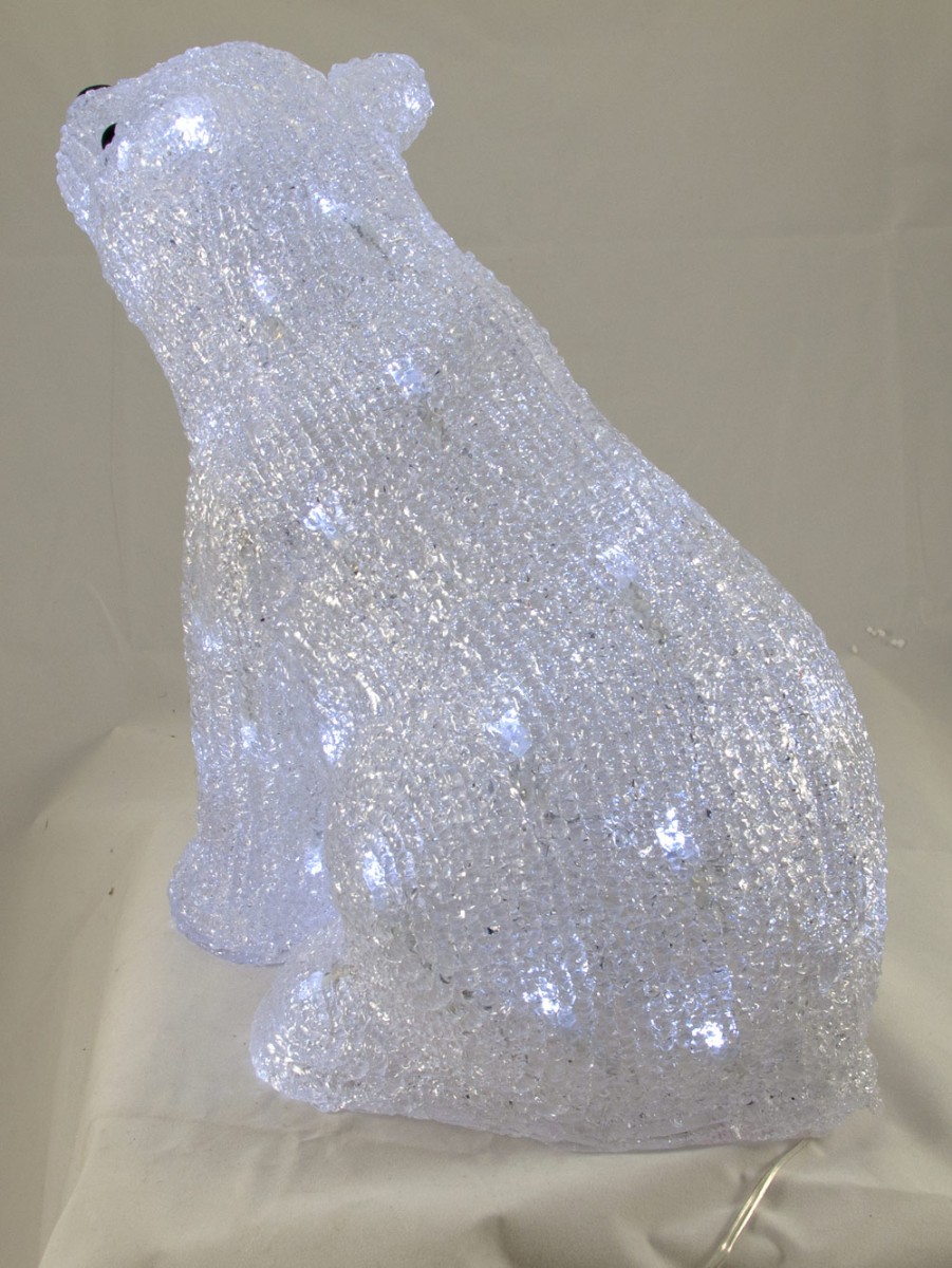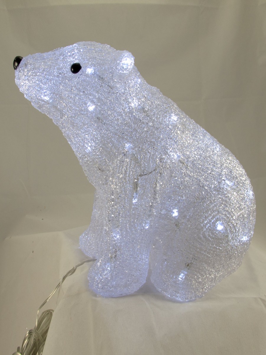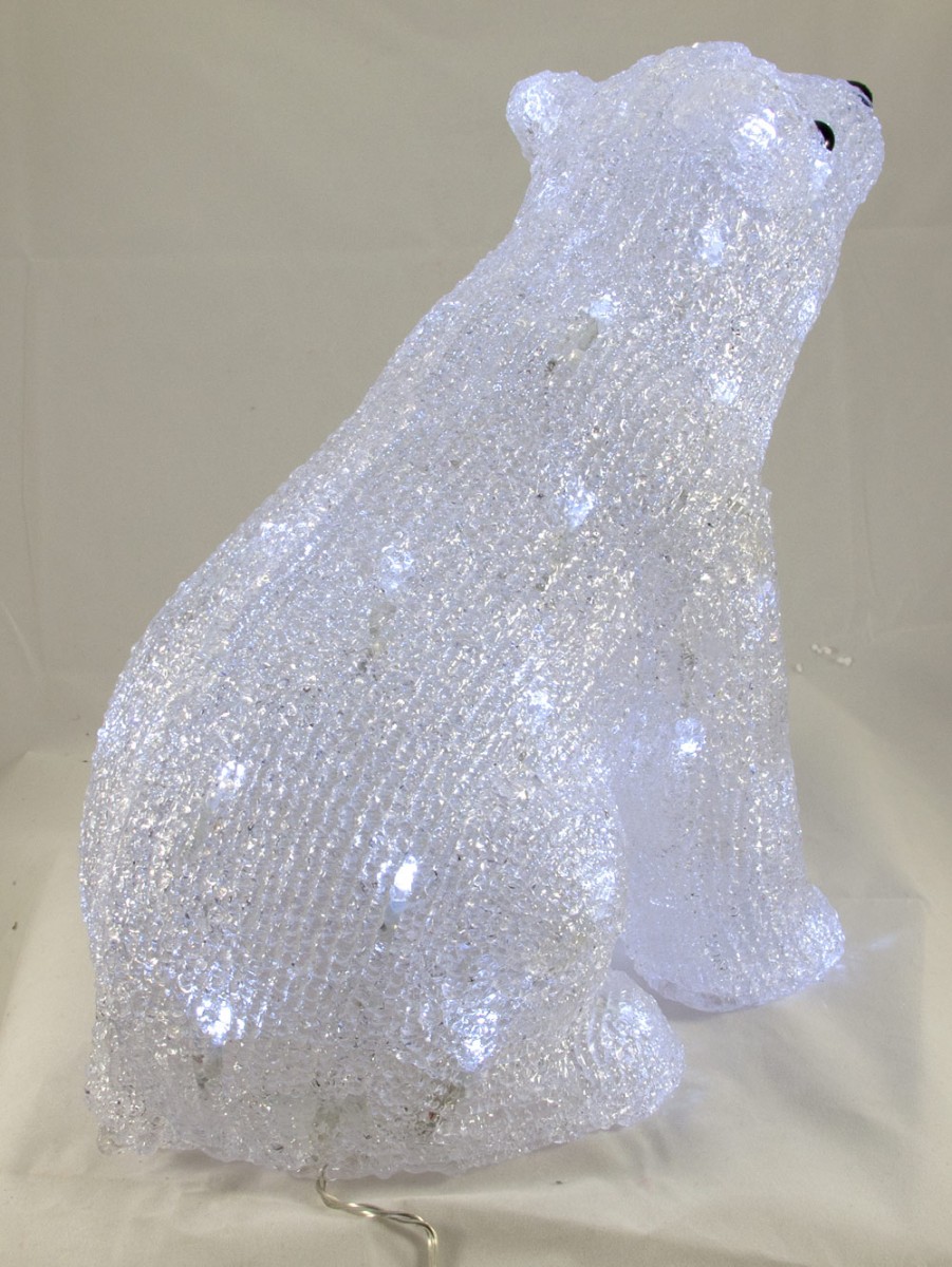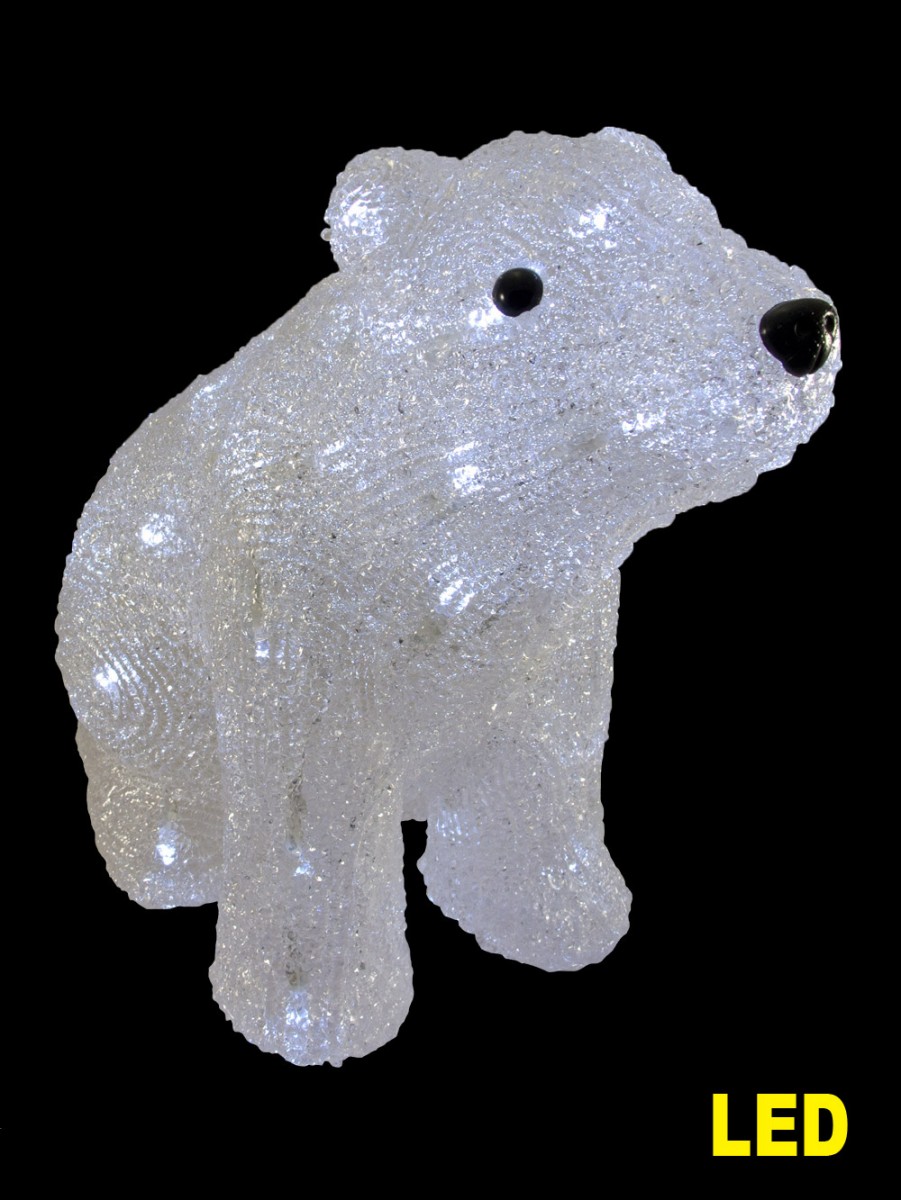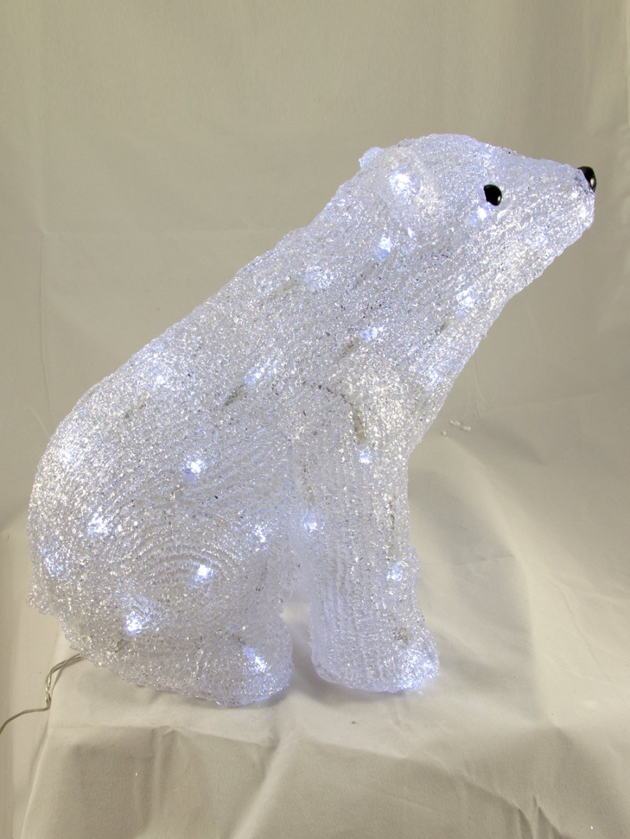 Adult male polar bears usually weigh between 351 and 554 kg, while thefemales typically weigh between 149 and 294 kg. The females sometimesweigh even more when they prepare to have their cubs. Fortunately, thisdisplay is not as heavy as a real polar bear, but is one of the most loveable ofthe Christmas decorations featuring an animal. The beautifully textured spunacrylic bear is sitting down, and is covered with 48 white static burn LEDlights. Measuring 300mm x 285mm x 100mm, the decoration can bedisplayed either indoors or outdoors.