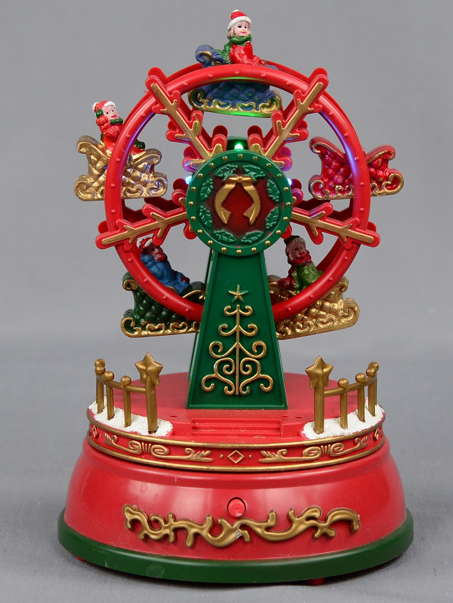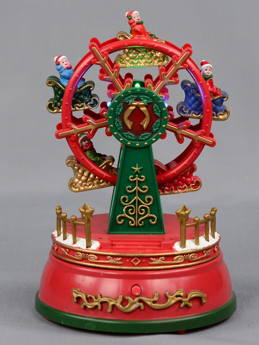 What comes to your mind when you think of Christmas carnivals? Most of you thought of a beautifully decorated Ferris wheel with kids enjoying riding it, people gathered around talking, and the white blanket of snow covering the ground. This Ferris wheel village scene figure will remind you of exactly that scene. It is shaped like a winter snowflake, attached to a beautiful wreath on the wheel support, and detailed with a gold fence. This decor will blend with all your Christmas themes. The wheel is red as a cherry, with an intricate gold pattern. The kids riding the wheel are adorning a Santa Claus cap with the seats shaped like a sleigh, and the lower wheel supports are painted green. All of these colors scream Christmas and would be a perfect adornment!