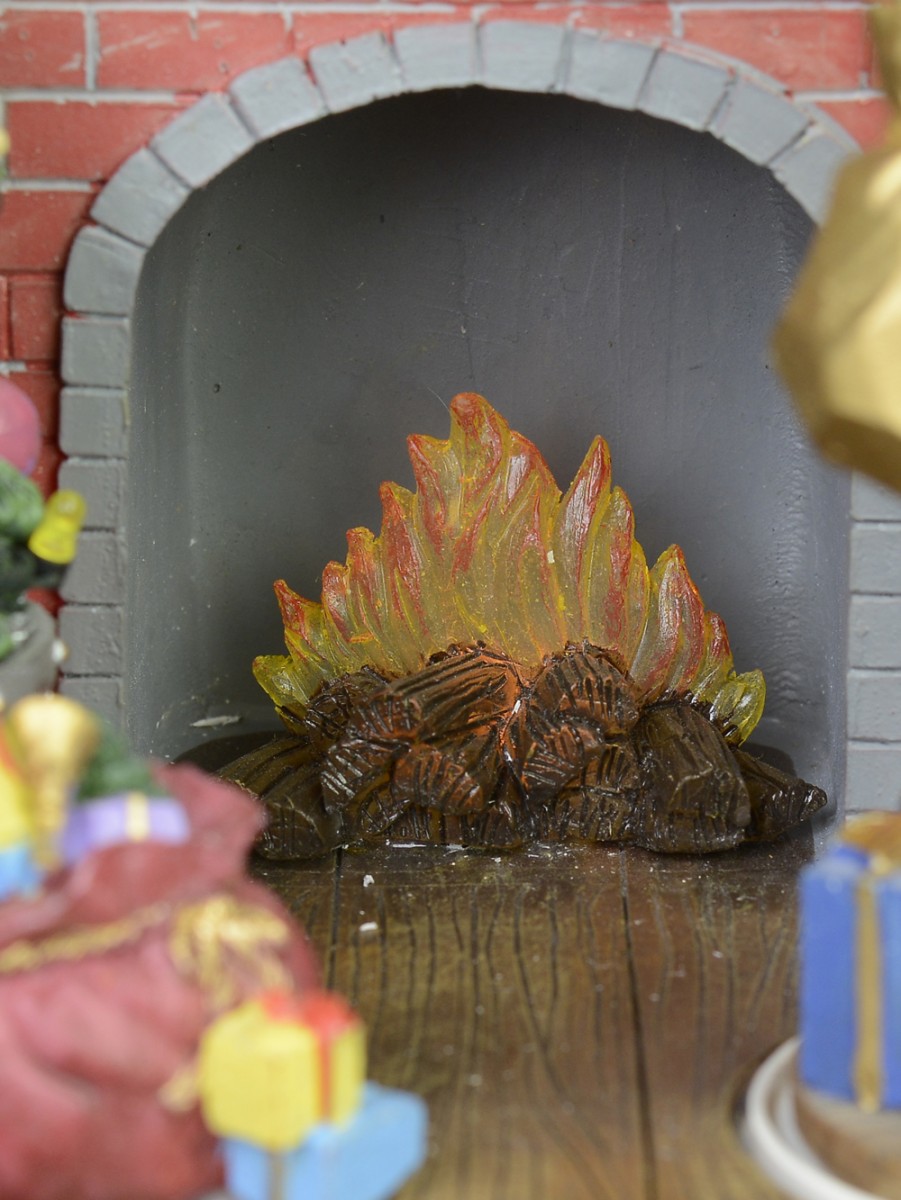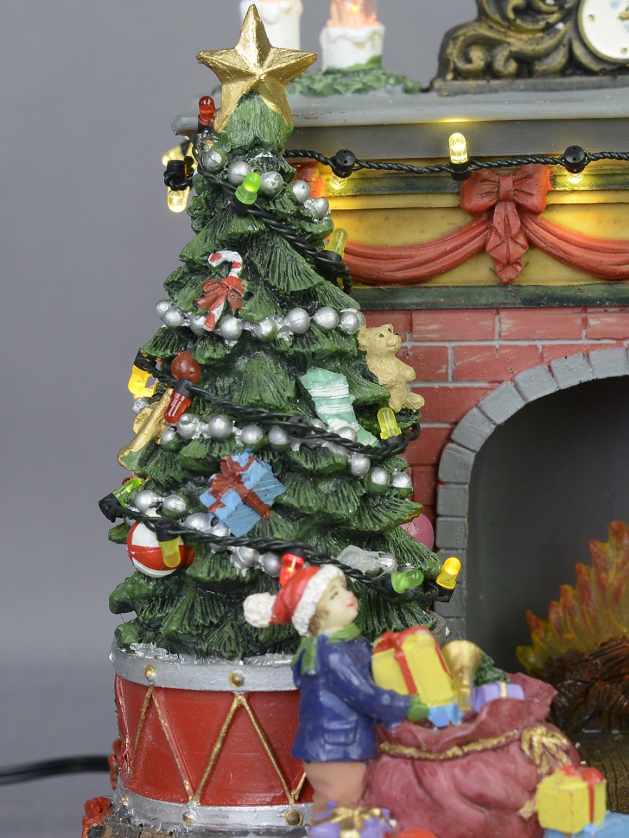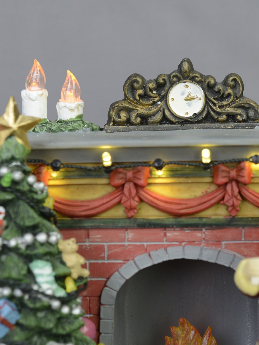 Illumination includes soft white fairy lights on fireplace, glowing orange fire, flickering candles and on/off green, red & yellow fairy lights on the Christmas tree