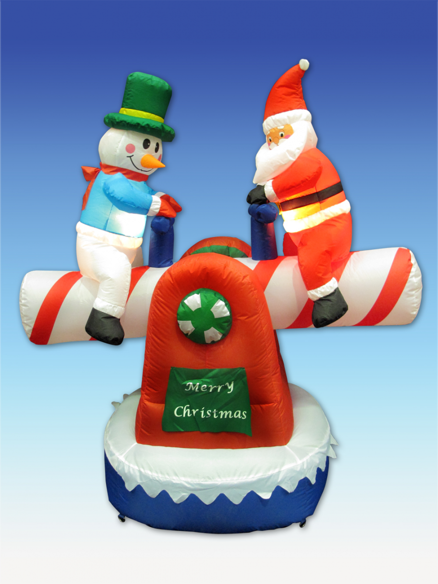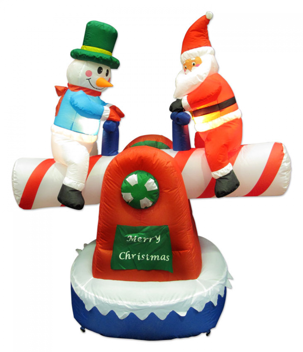 The Animated Santa and Snowman on See Saw inflates quickly with an internal fan so it's easy to get ready for the party. The inflatable measures 1.3m x 1.4m x 80cm and is lit from within with a static burn. Santa is dressed in his classic fur-trimmed red suit ensemble, and the Snowman is looking the part in a blue shirt, red scarf and mittens and a dark green top hat, trimmed in gold. He has a cute carrot nose and rosy cheeks. They're sitting atop a candy cane see saw which is trimmed in red, green and blue, and features a Merry Christmas message. The Animated Santa and Snowman is suitable for both indoor and outdoor use. You could invite them to the office Christmas party, make a great shop window display (just add a few Christmas decorations and you're done!), or they'll take pride of place on the roof of your home or business. Wherever they roam this Christmas, this Santa and snowman are pretty sure to get everyone's attention.