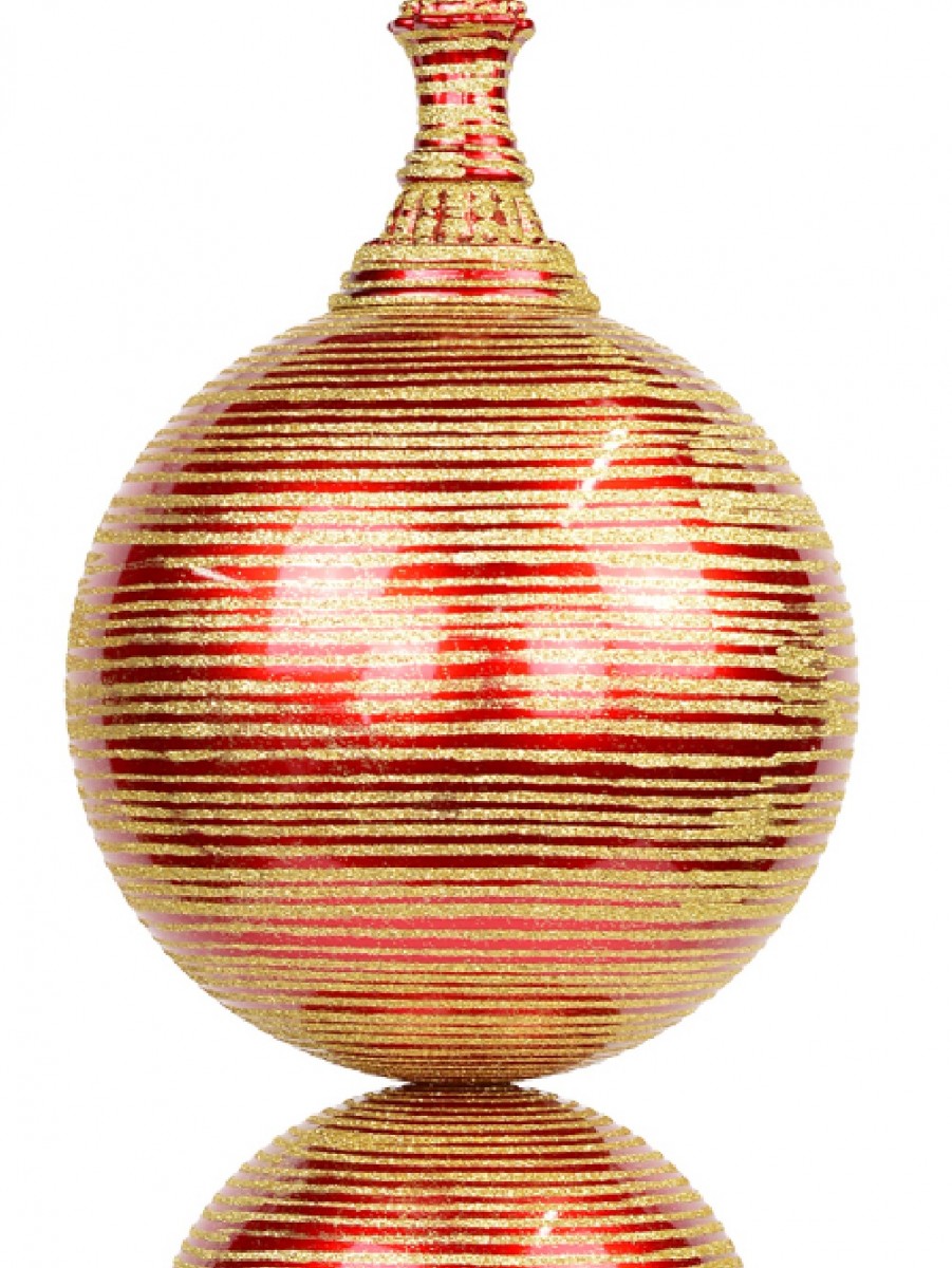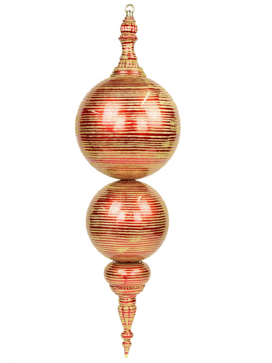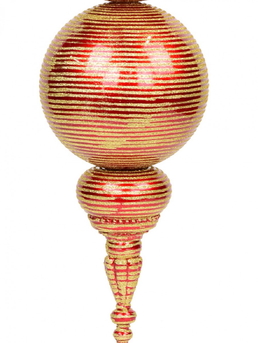 This huge decoration is a combination of red baubles with gold glitter striped detailing and various shapes, each tapering in size towards the base. Measuring 85cm in total length and 30cm in width, this finial will look stunning when suspended from above in a large area as it will wonderfully emphasize its dimensional construction and size! There is a small gold ring at the top to attach a cord, ribbon or wire of your choice and you can also make it a lovely display for the entry of weddings, parties and other events! This product is designed for indoor use and is sold individually.
