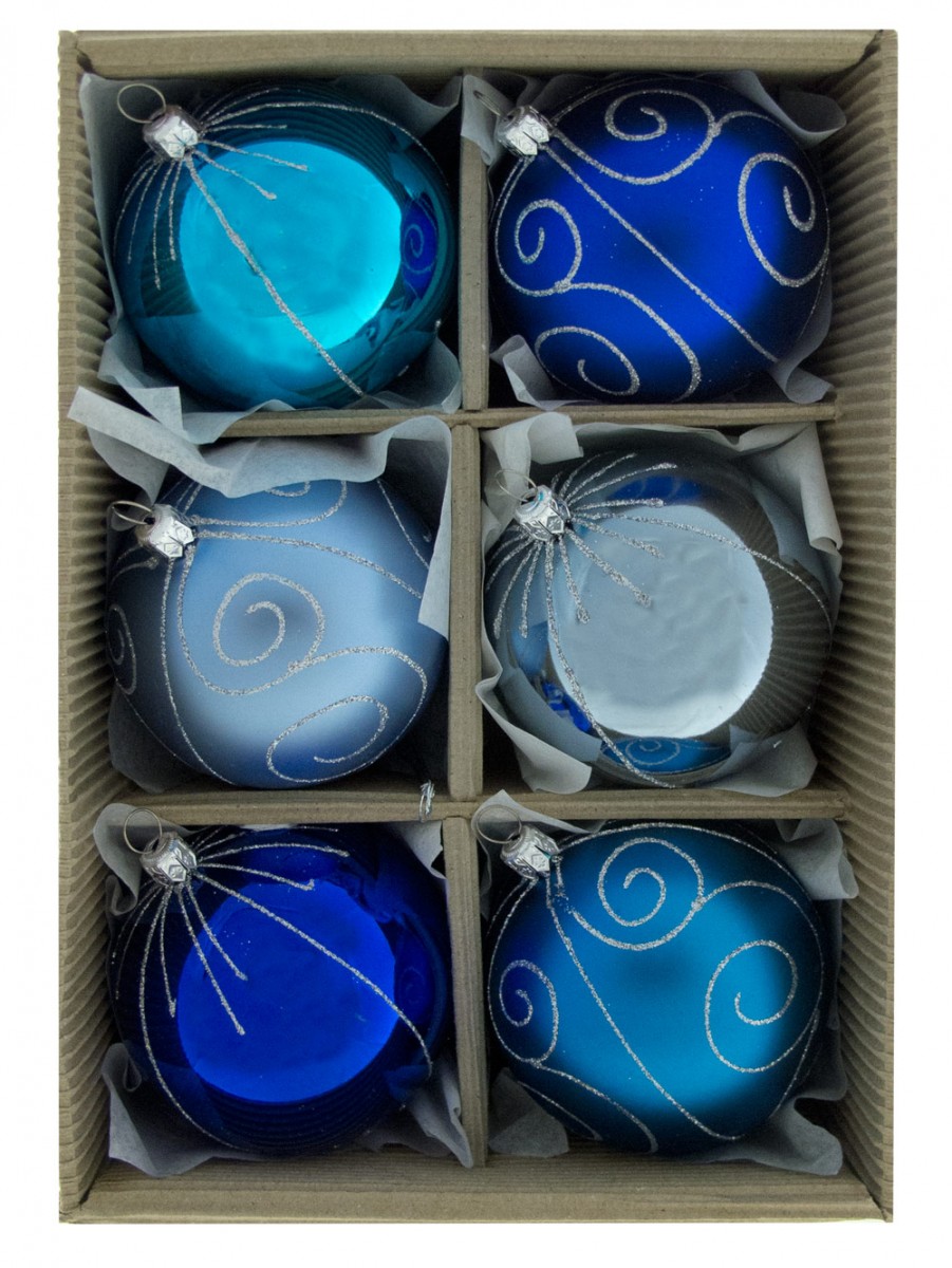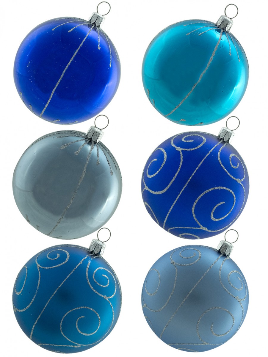 Comprising 6 baubles in different shades of blue, these gleaming ornaments will make your Christmas tree one that truly stands out from the crowd. The baubles measure 80mm across, and are available with two different styles, making them all you need to decorate your tree. The blue-toned baubles are available in a matte-finish and glossy metallic-finish in the blue shades of cobalt, plae and aqua. Each bauble has a different silver glitter pattern finish. One thing's for sure: with these mixed baubles you'll be ready for Christmas morning in no time at all!